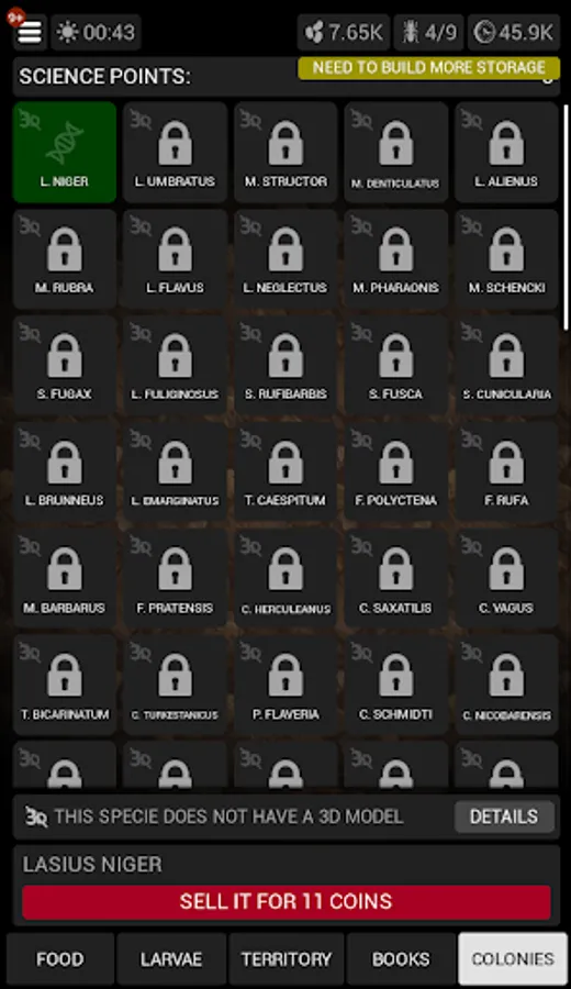 We study ants and their habits. For new discoveries, we get rare species of ants to study. The government has cut our funding, so you will have to buy and sell colonies yourself.