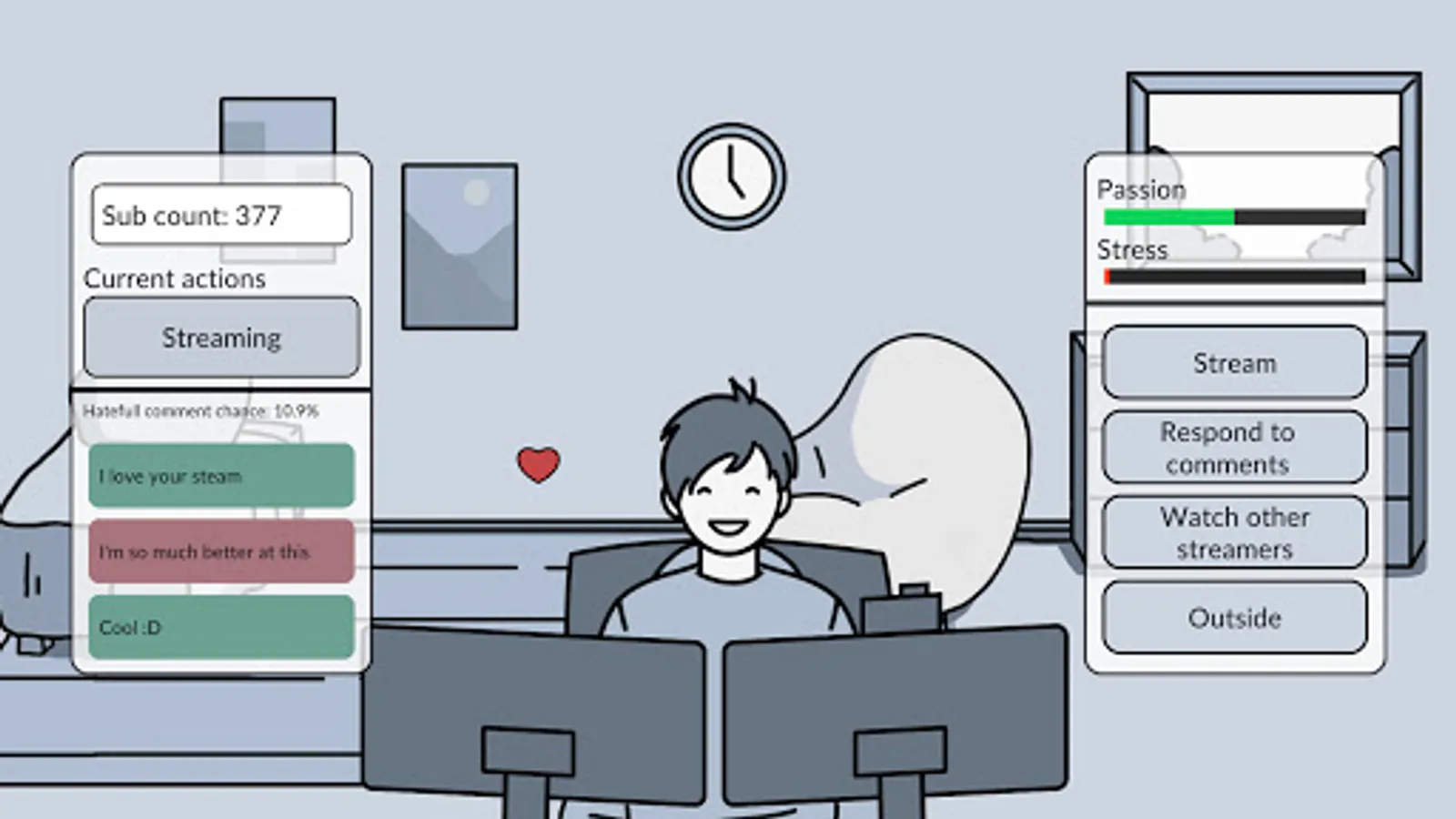 In the game, you take the role of a YouTube streamer. Your goal is to keep a balance in your life, between building your subscriber base and keeping a civil discussion in the comments, all while maintaining your psychological stability.