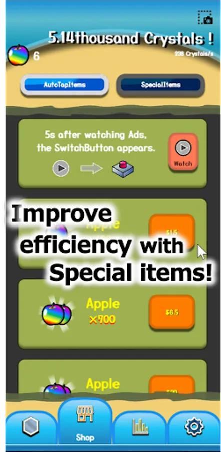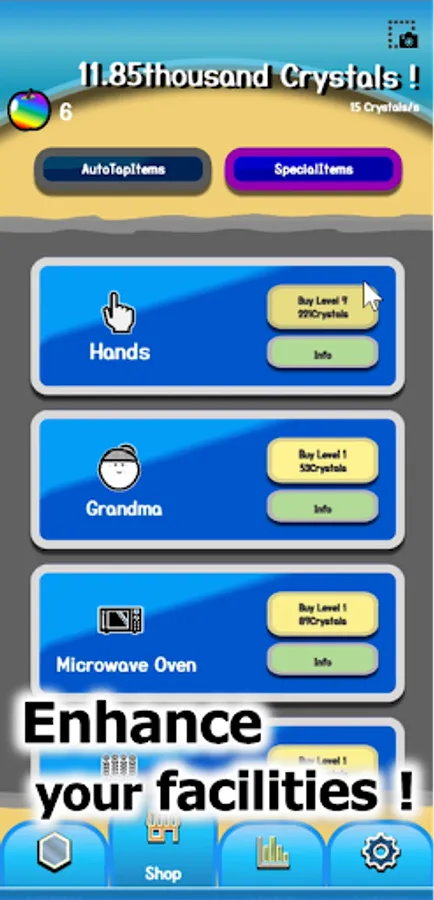 Strengthen your facilities. Strengthening auto-tap items will increase the number of crystals every second automatically. You can increase the number of crystals efficiently even when you are not tapping!