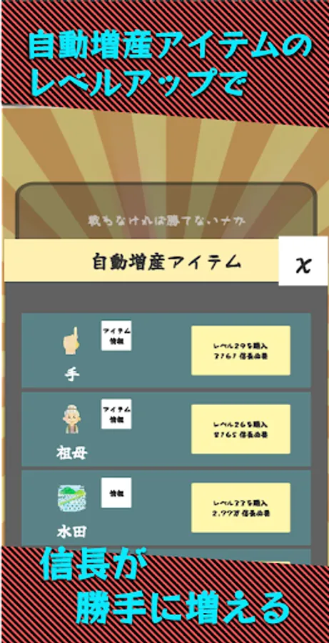 ・People, food, places, etc. related to Nobunaga Oda are used as items for automatic production increase.
