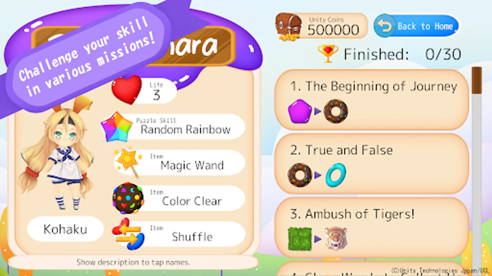 Complete puzzle stages, get Unity coins, and unlock characters.