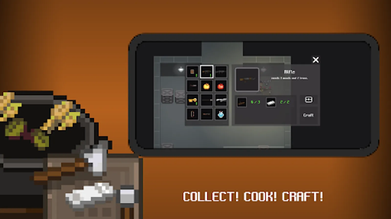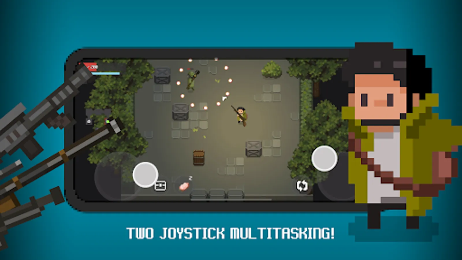 DAWNGEON is a pixel graphic mobile RPG (role-playing game) adopted from roguelike (random generated dungeons and monsters) gameplay. The player uses two joysticks to move and attack, which requires a lot of skills to master. Around 50 different items and weapons with interactable objects enable fun gameplay! The player can fight, cook, grow, and explore.