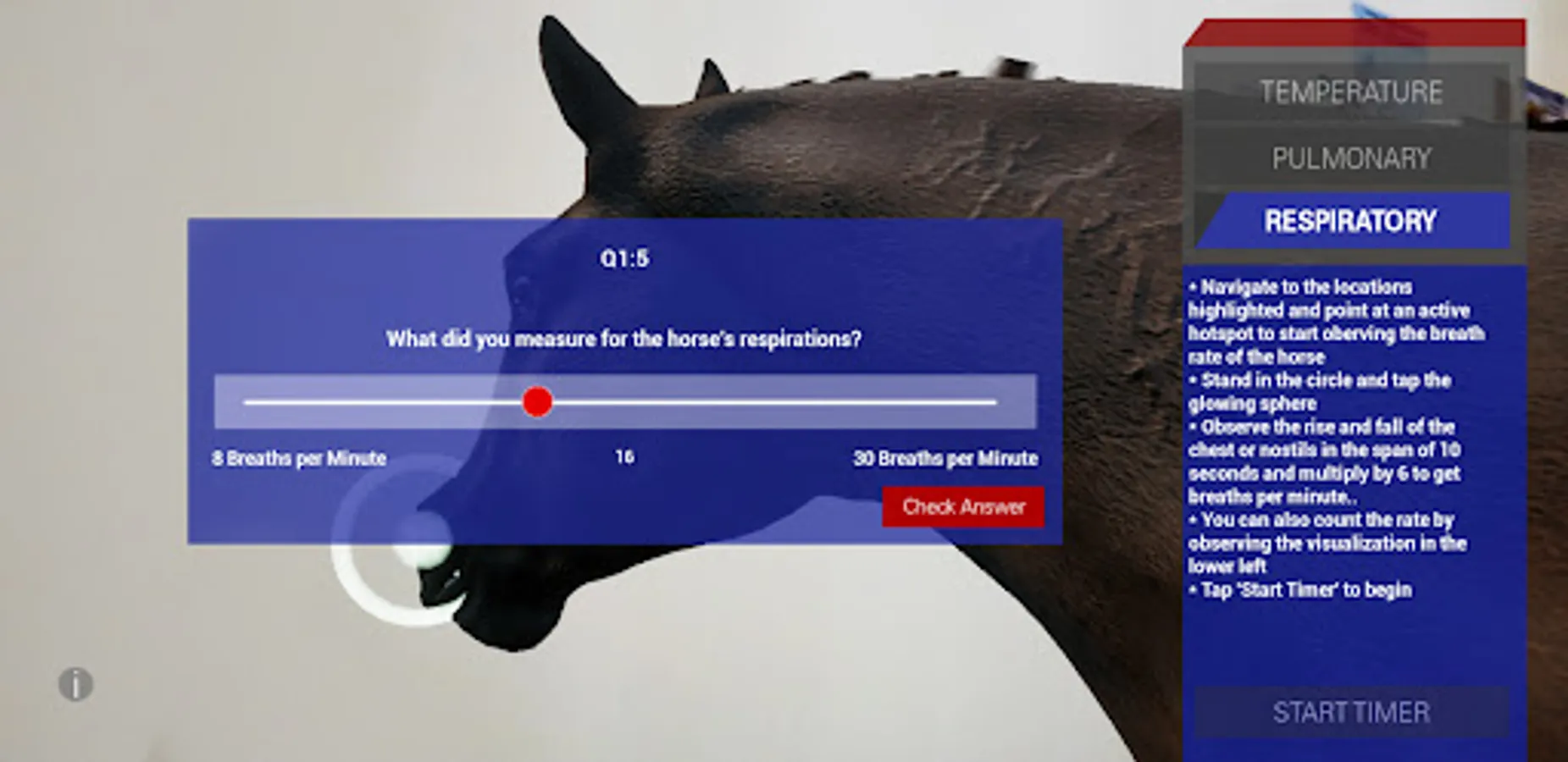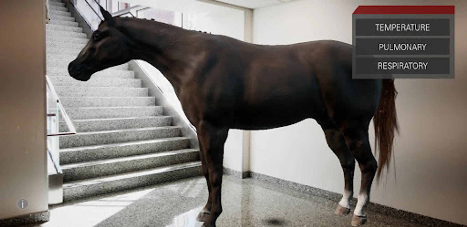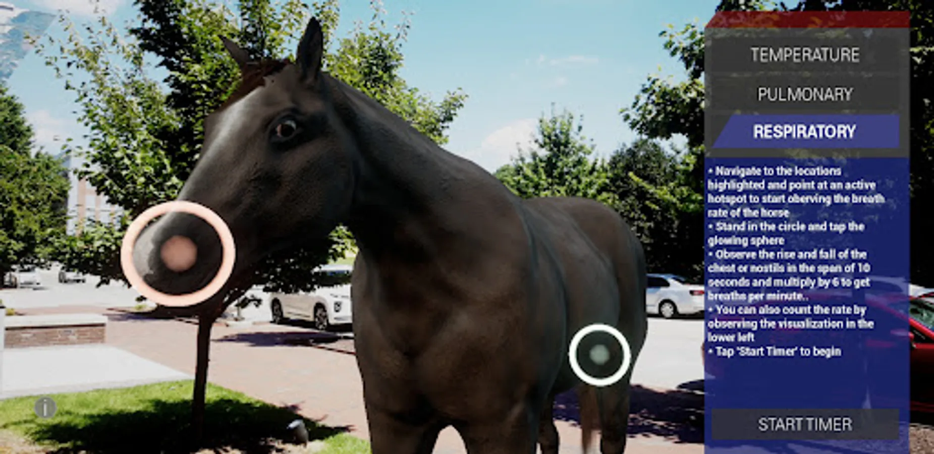 From the stables to your living room, harness augmented reality to learn some of the core principles of performing an equine wellness exam! This app allows you to walk all around a virtual horse as you practice taking its temperature, pulse, and respiration. After taking each measurement you will learn what each of these can tell you about your horse’s well-being and how to care for them.