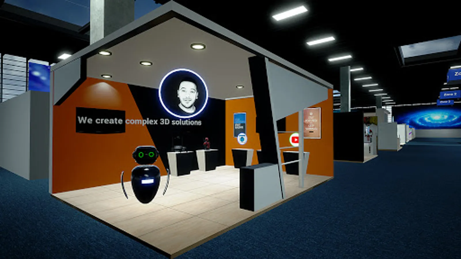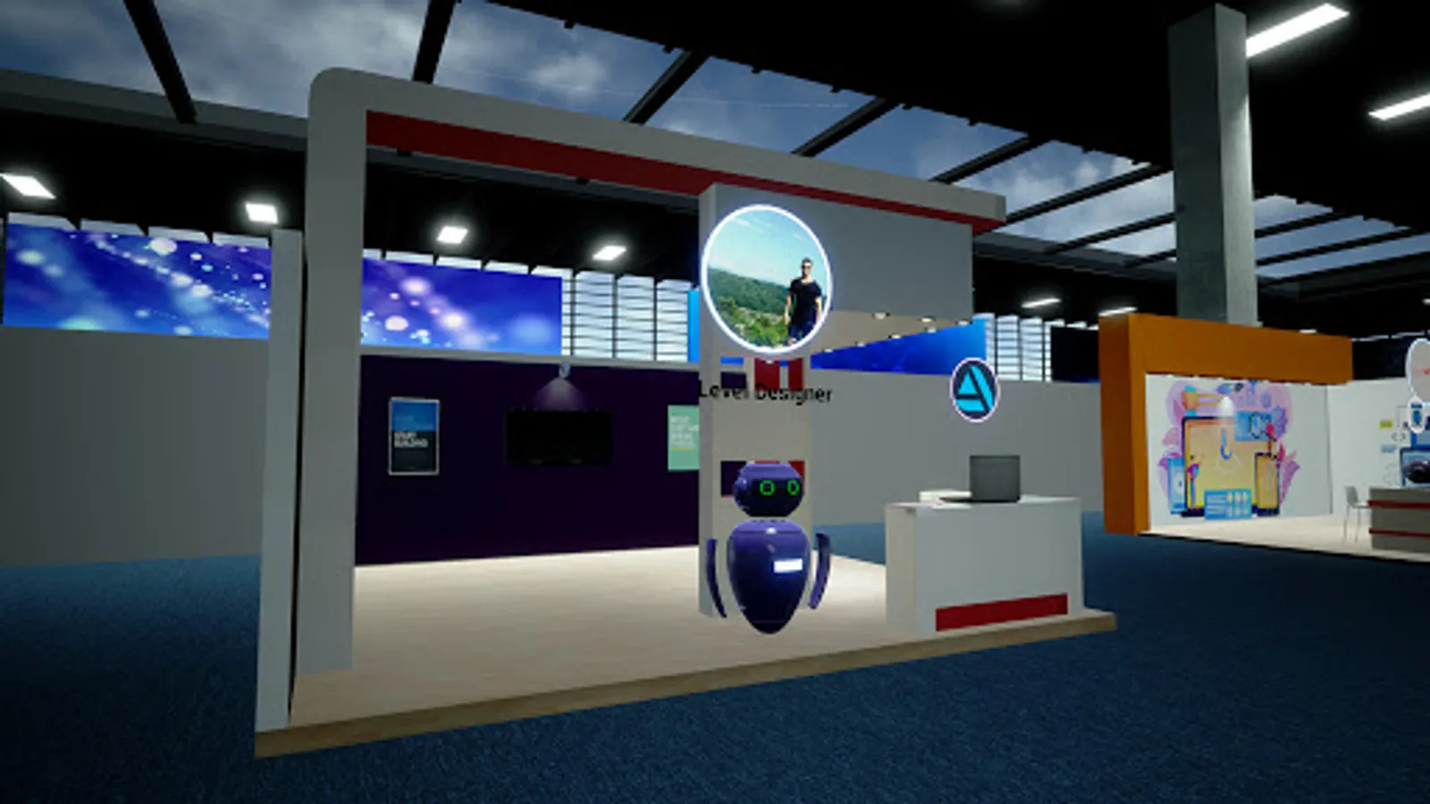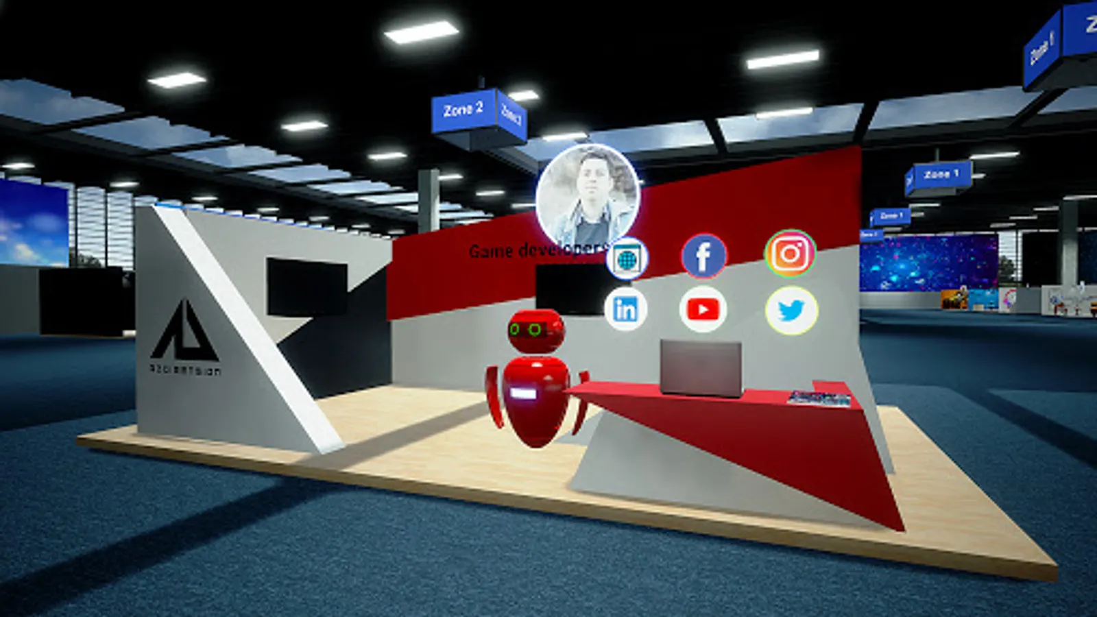 The building itself is modeled after the Expo Center in Azerbaijan. And there are many virtual stands. Here you can take part in : game developers, software and web developers, 3D Artist, designers, etc. A virtual stand can be used by participants to show: video, slide show presentation, as well as animation of 3D objects.