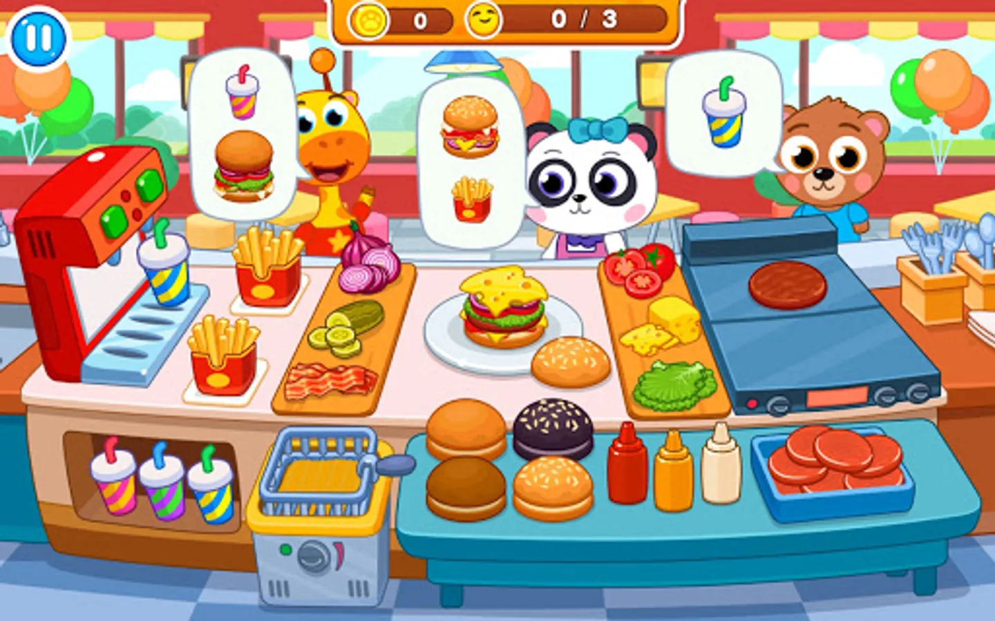 orders. Then go to the kitchen, today you have to prepare a lot of delicious meals. Making burgers, toast chops and put them carefully on buns.
