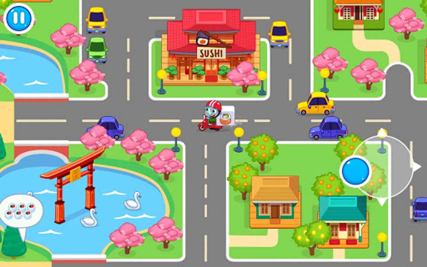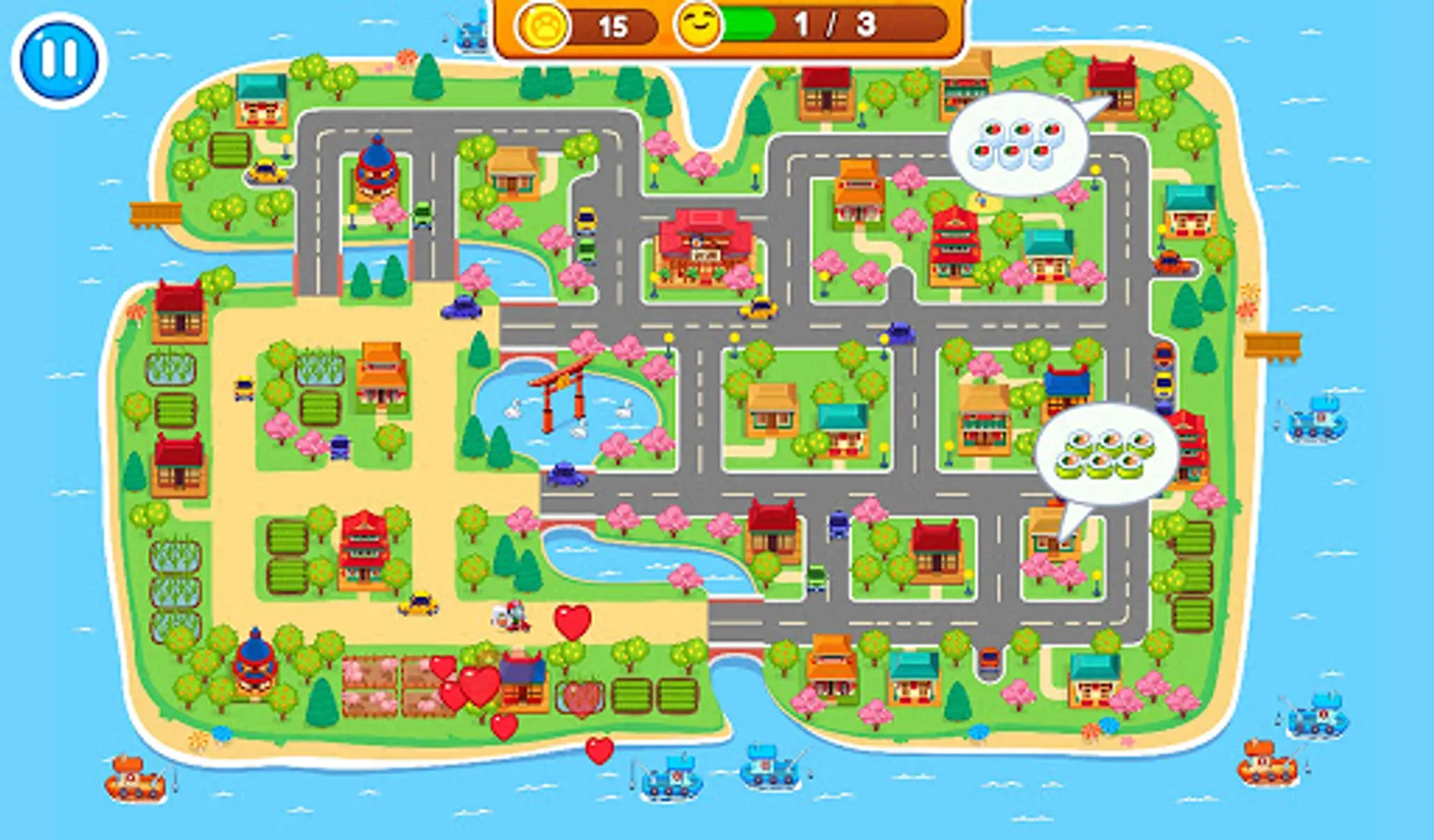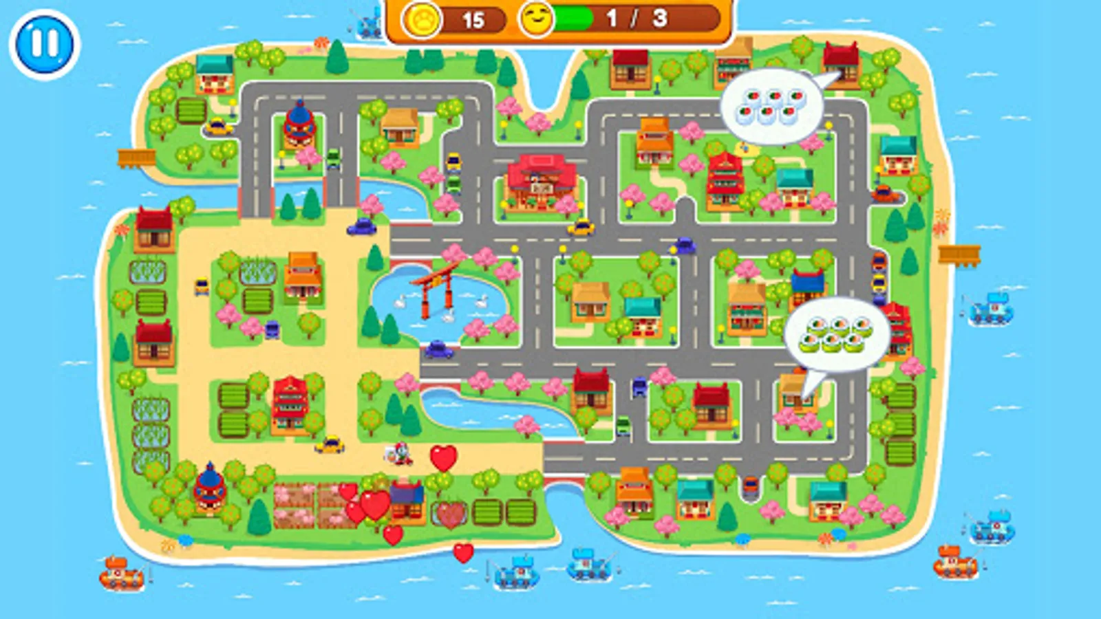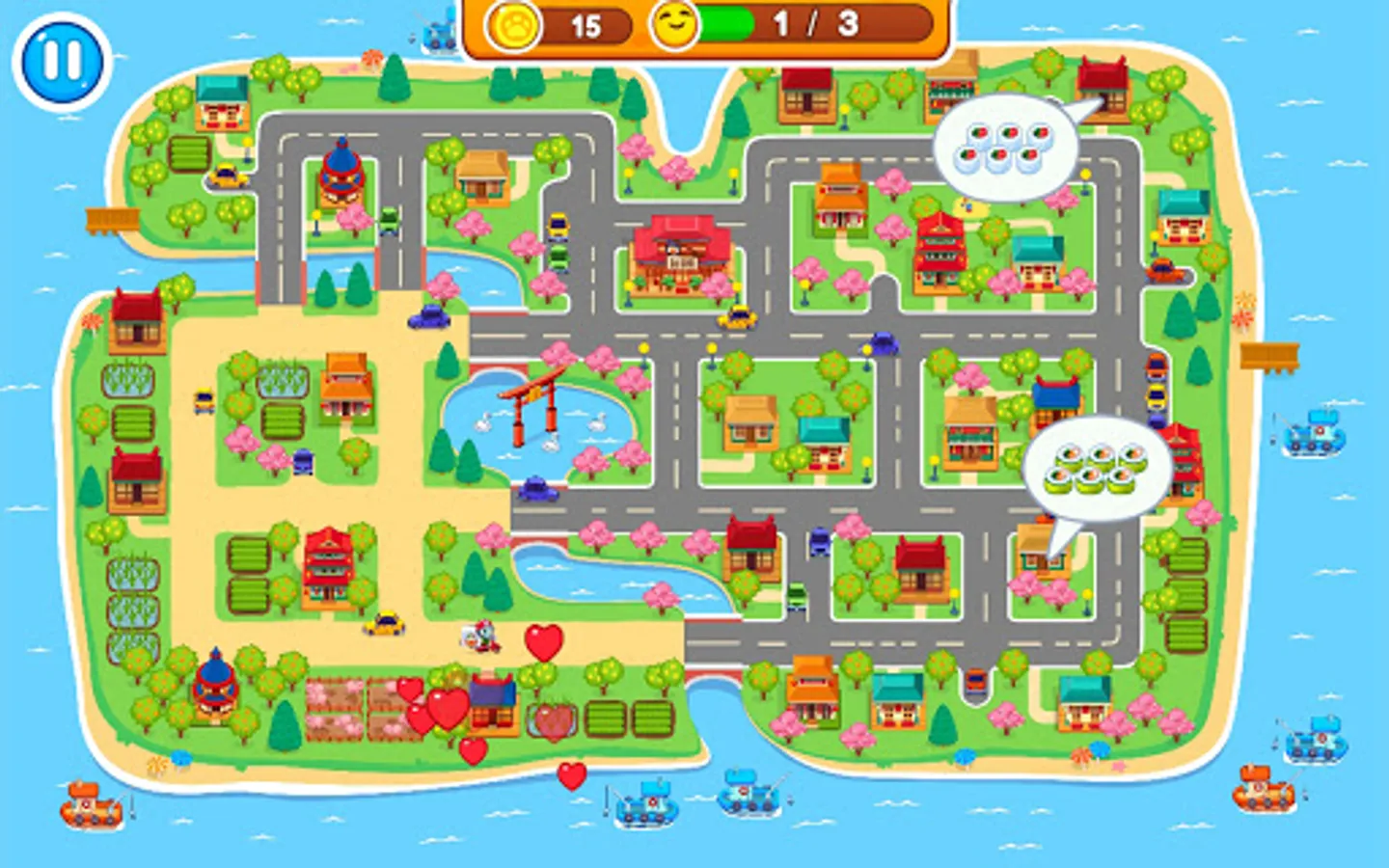 Well, let's get started! Today you our restaurant is full of visitors. Quickly accompany them to banquet hall, suggest them to take seats and start gathering orders. Then hurry up to the kitchen and start cooking. Do you want to learn how to make rolls? It's very easy! Just place a sheet of nori and cover it with a thin layer of rice. Then add shrimps, fish and other ingredients in a line on top of the rice in the centre. Roll it all up and cut it in equal pieces. Put them carefully on a plate. Add some wasabi and ginger. That's it! Meal is ready! Now you can serve it. Offer to your guests tasty and aromatic tea. Full and satisfied clients will reward you with coins. Further you can use them to upgrade your place. Also some one can order delivery, to houses. In the streets of a small but beautiful town.