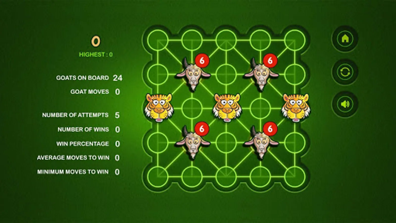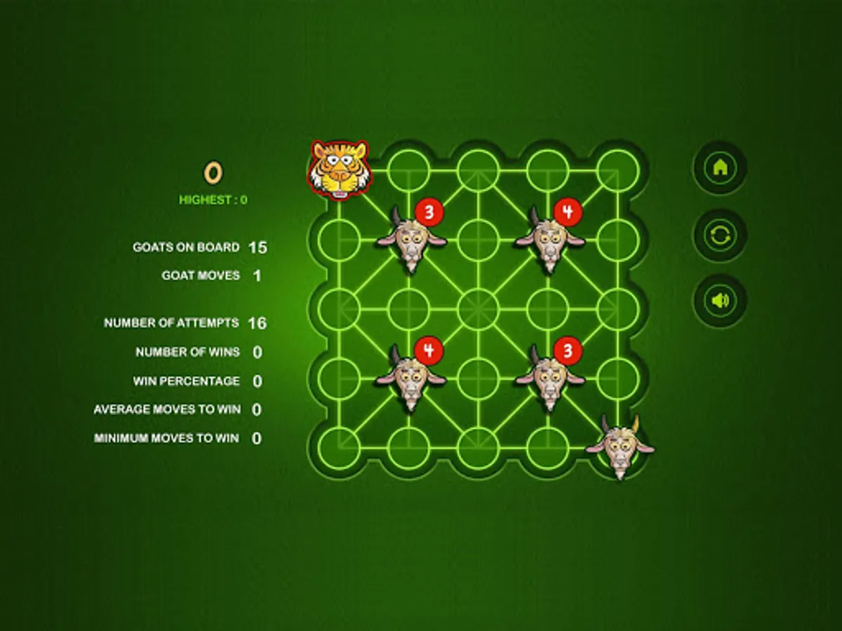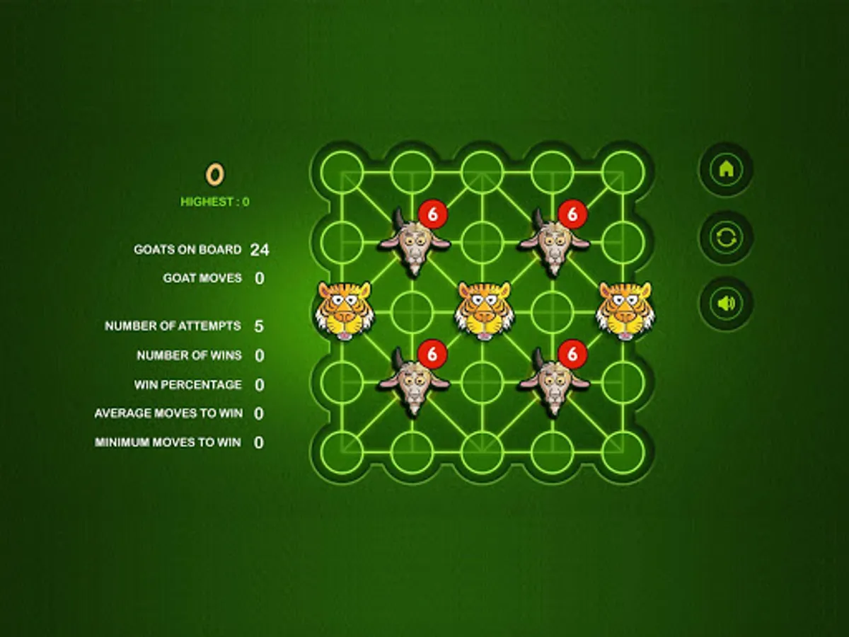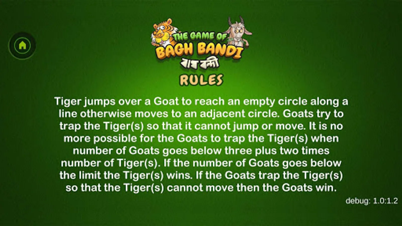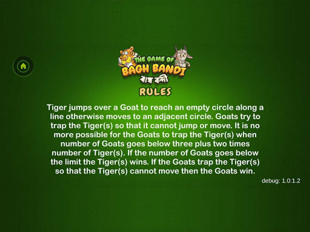 The Game of Bagh Bandi is an Indian strategy game known as Bagh Chheli in Northern India and as Bagh Bandi in Bengal. The game is played in turn between the tiger and the goats. It's basically a two person complete information game with no luck factor. The number of tigers can be chosen between one and five. The initial number of goats increases with the number of tigers. The goal of the herd of goats is to trap the tiger so that it cannot move any more while the tiger tries to kill or escape. I have kept the board unaltered while tamed the rules a bit for simplification. The reference is available in Wikipedia. Wish you enjoy the game.