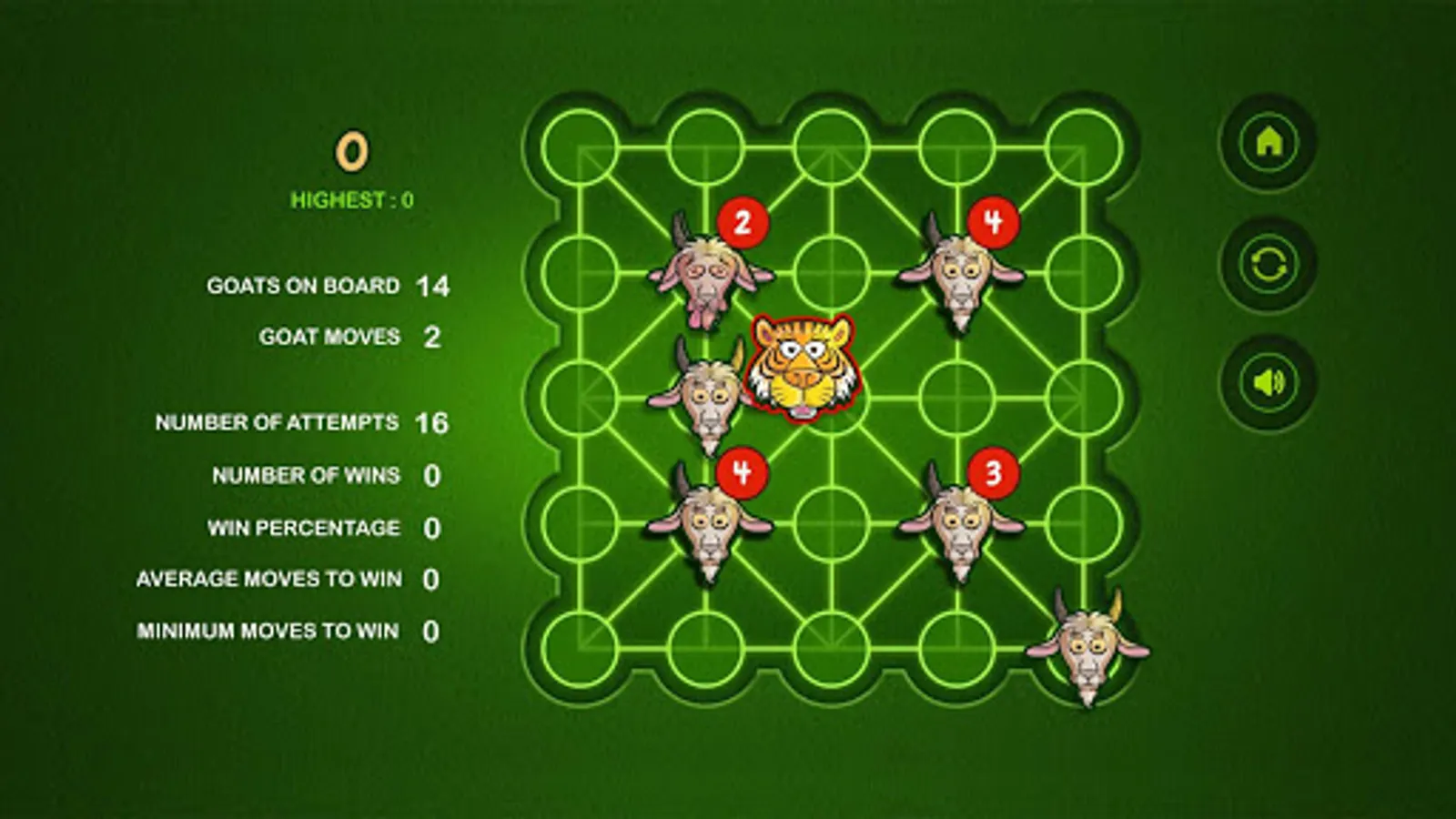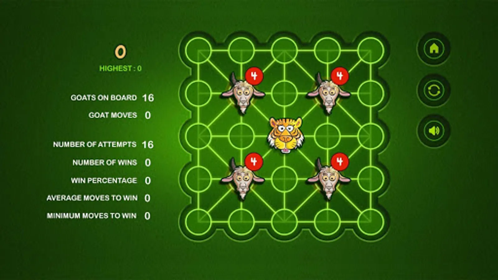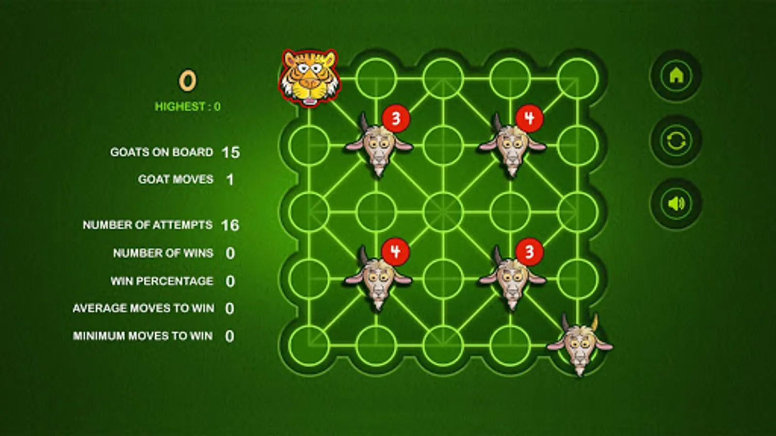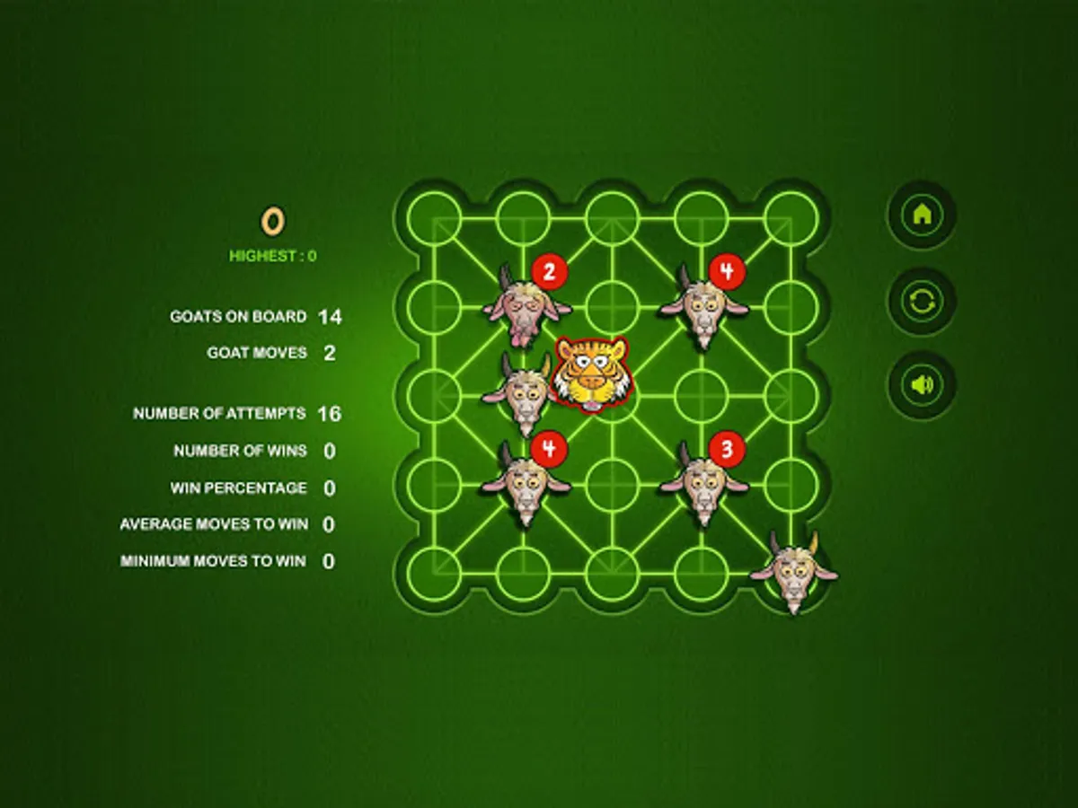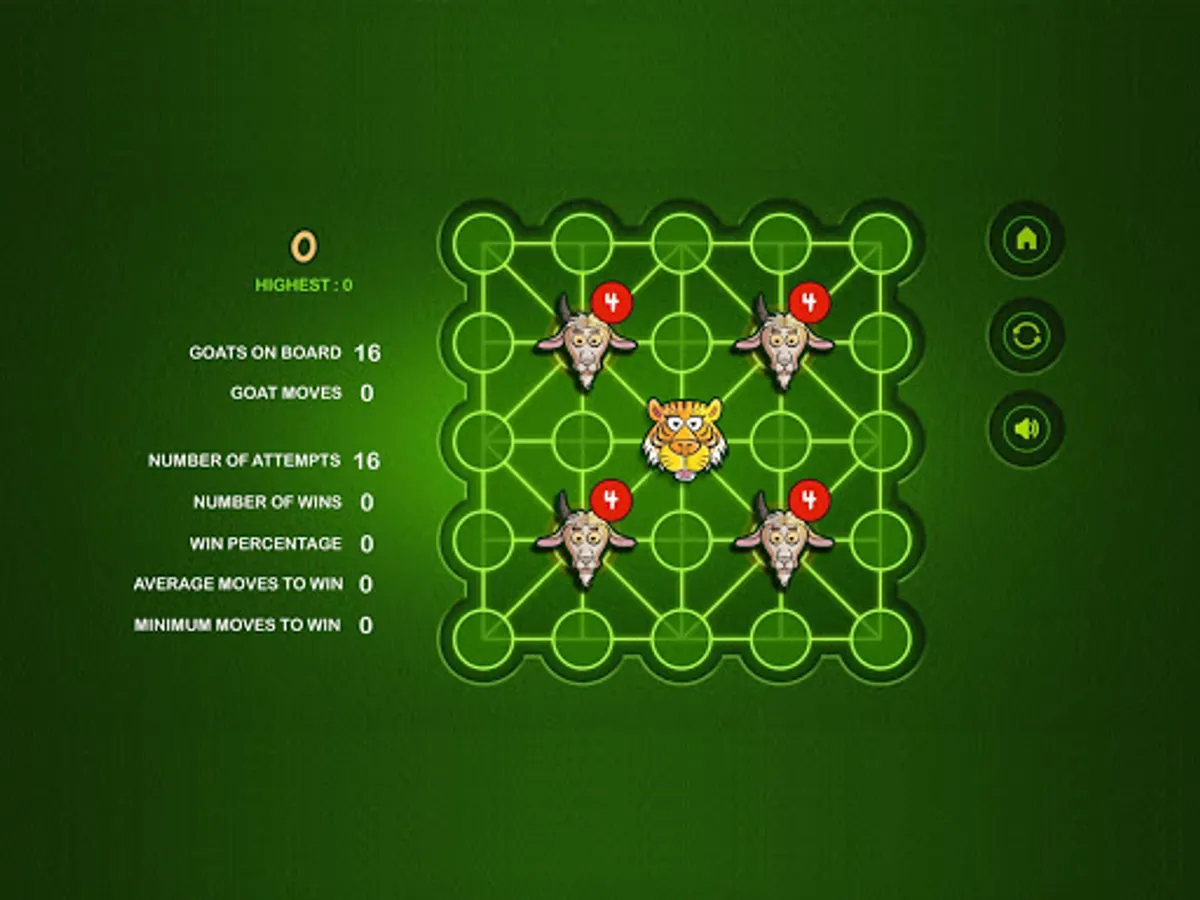 The Game of Bagh Bandi is an Indian strategy game known as Bagh Chheli in Northern India and as Bagh Bandi in Bengal. The game is played in turn between the tiger and the goats. It's basically a two person complete information game with no luck factor. The number of tigers can be chosen between one and five. The initial number of goats increases with the number of tigers. The goal of the herd of goats is to trap the tiger so that it cannot move any more while the tiger tries to kill or escape. I have kept the board unaltered while tamed the rules a bit for simplification. The reference is available in Wikipedia. Wish you enjoy the game.