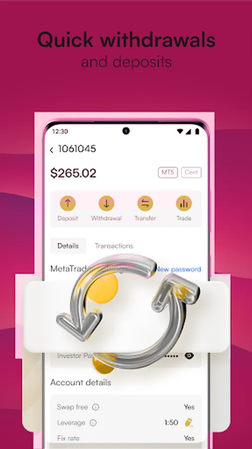 Make money moves with your full control. Deposit and withdraw quickly in the currency of your choice. Monitor current balance and get instant reports on all operations straight to the app.