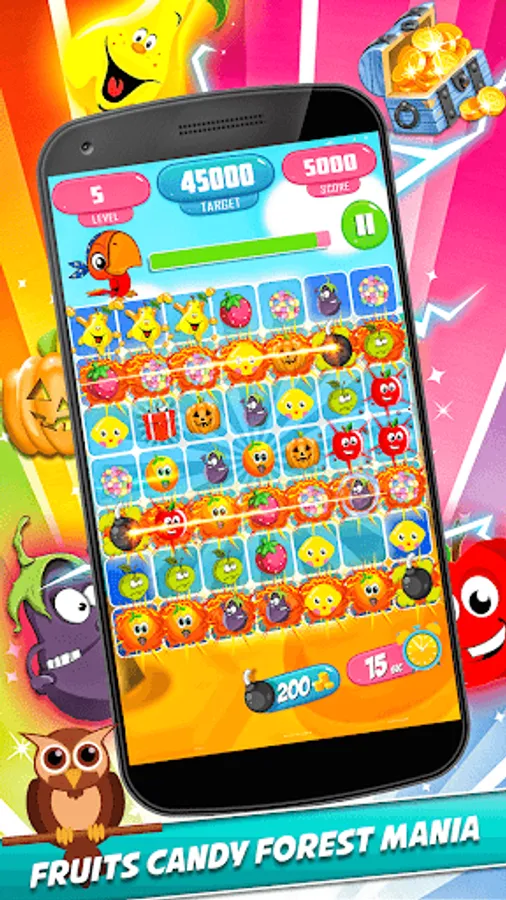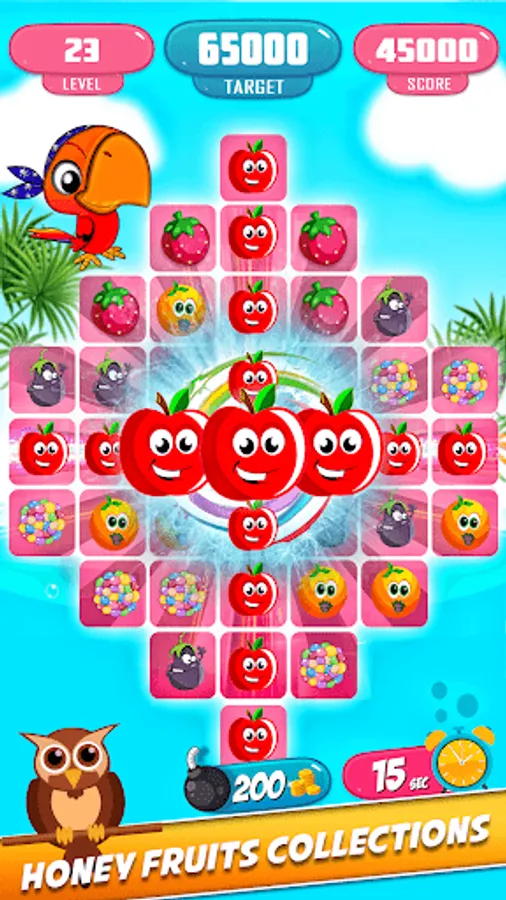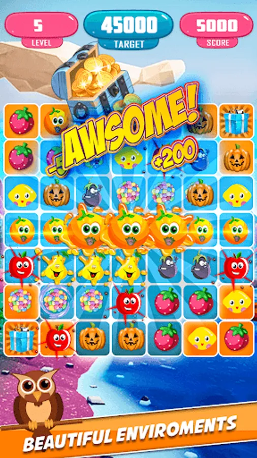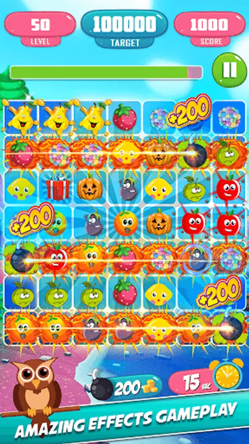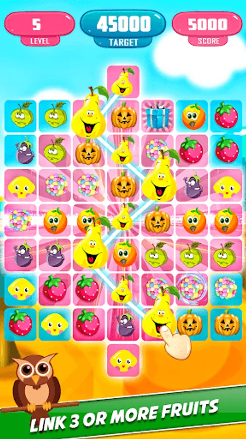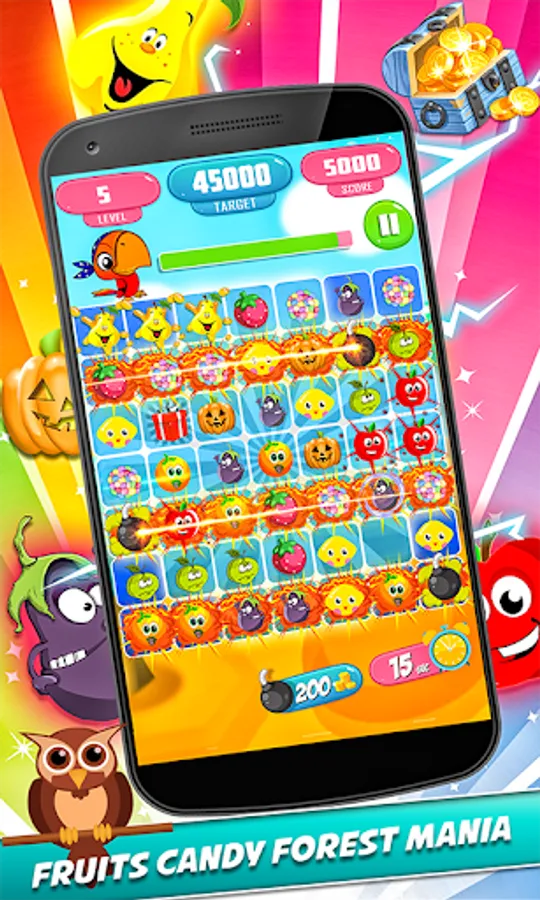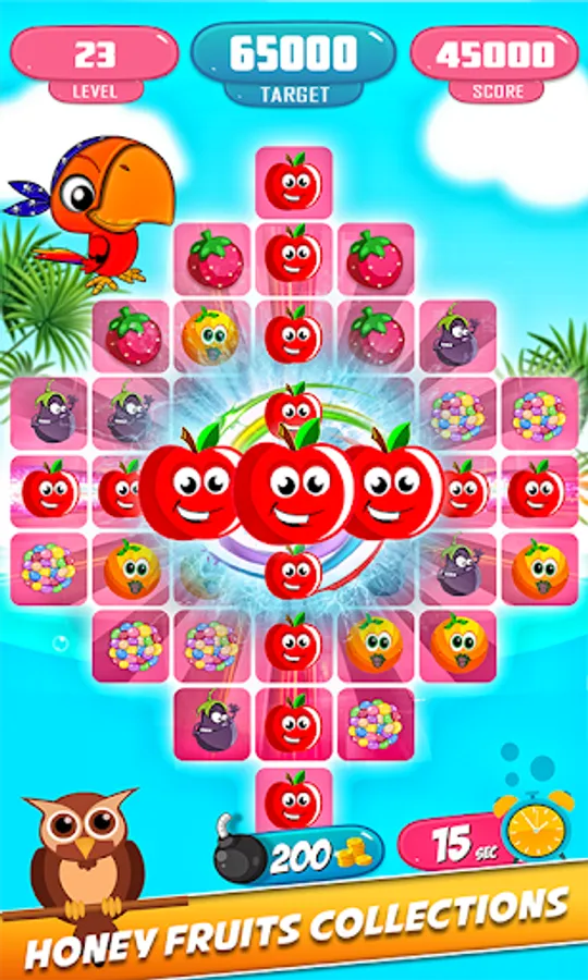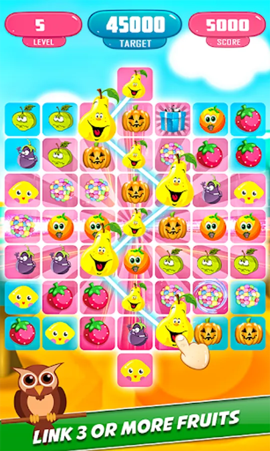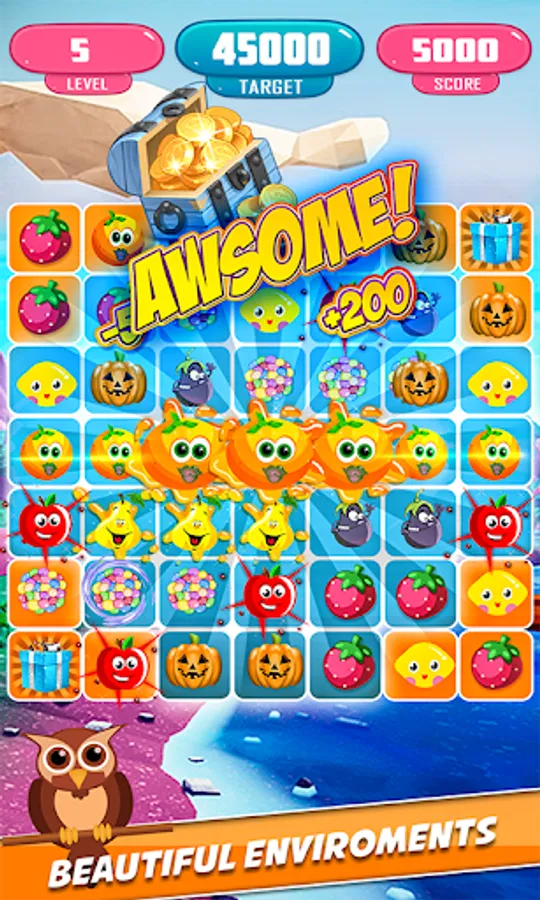 To go on the journey of exploring fruits candy forest world need your help! Unwrap & Collect fruit candies for them. Use booster and magic tools to blast! Blast more than 3 fruit candies will create powerful booster, use them to fruit blast all the challenging obstacles and reach your goal.