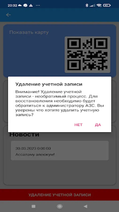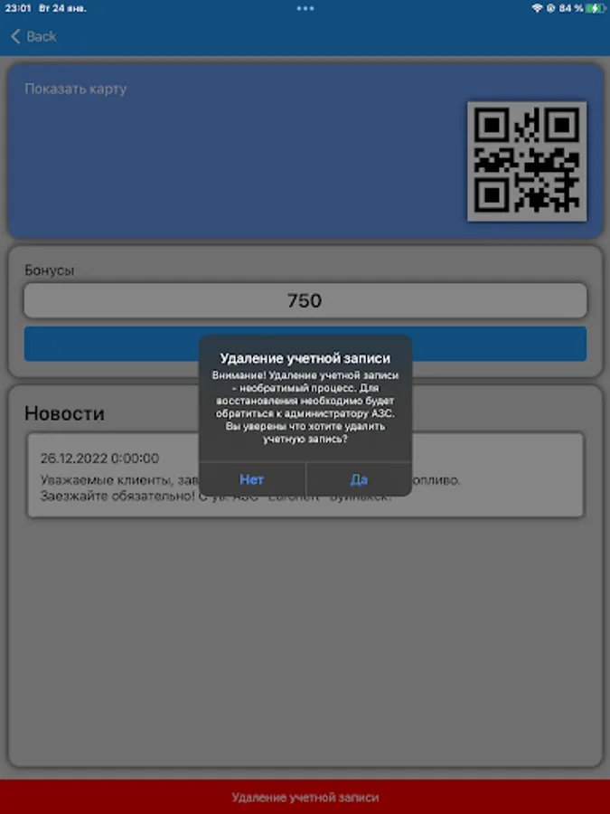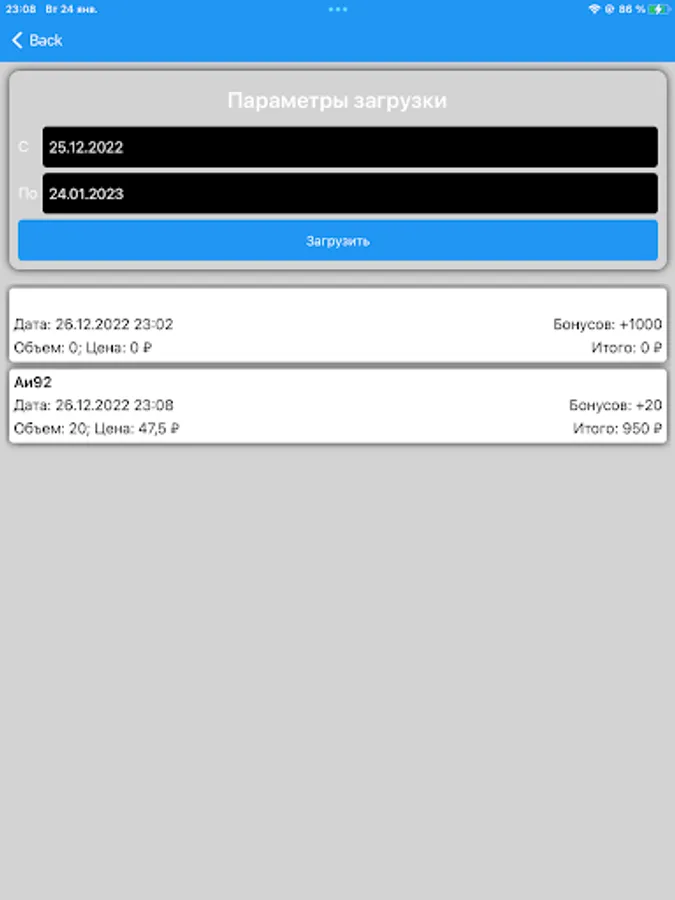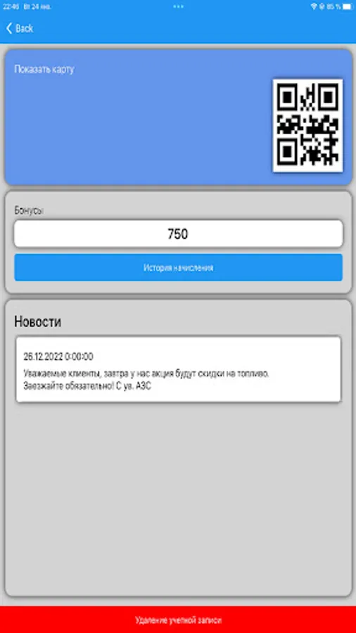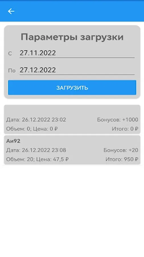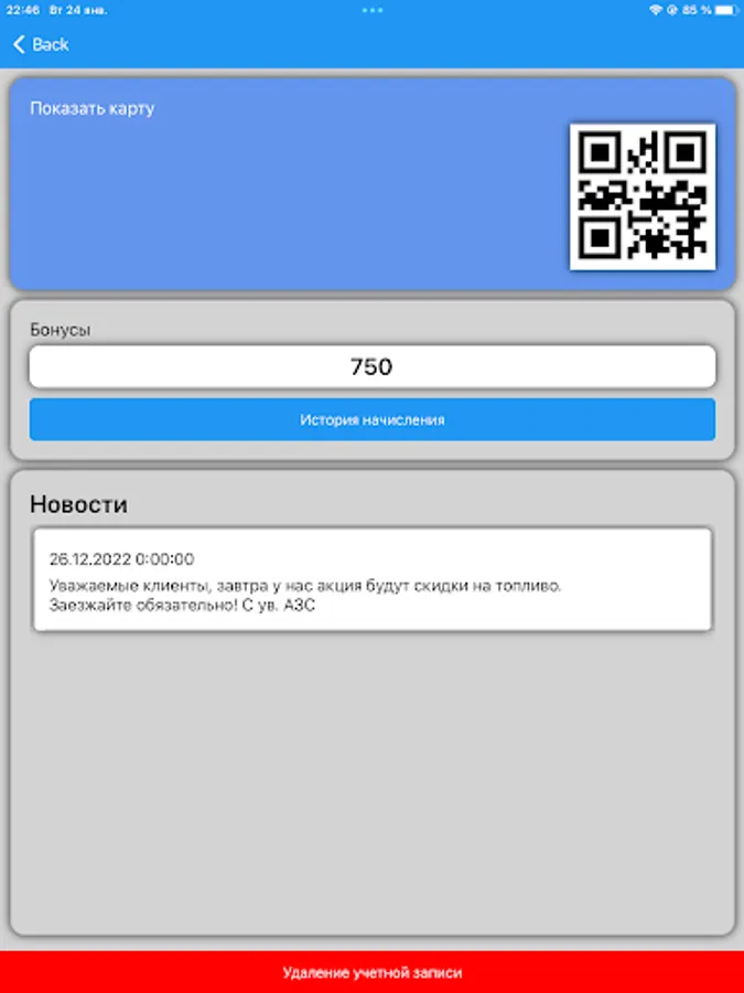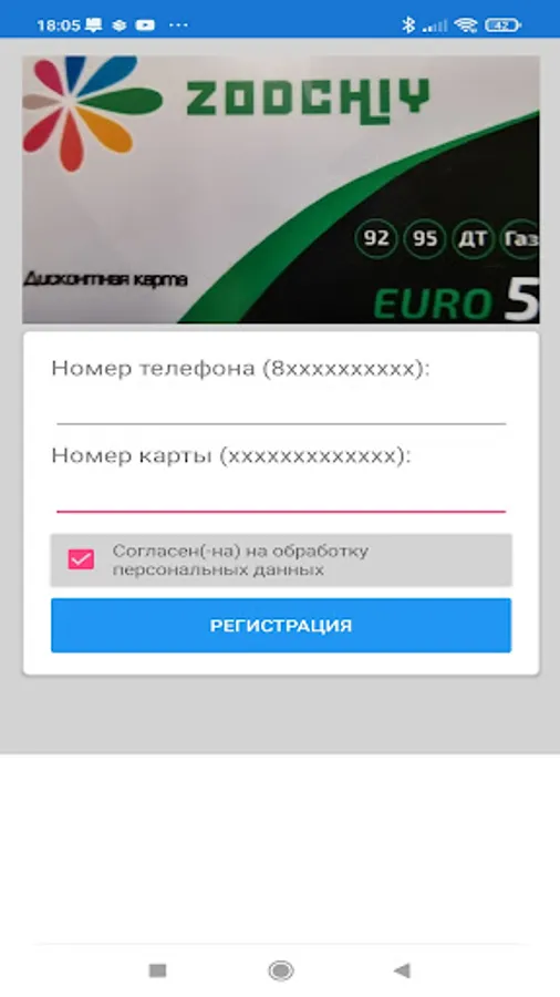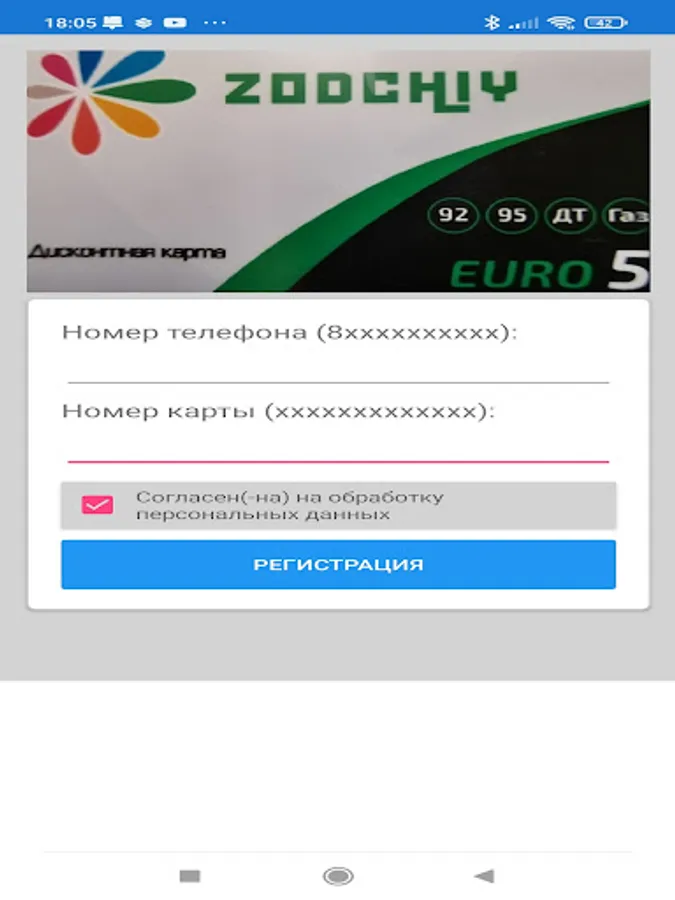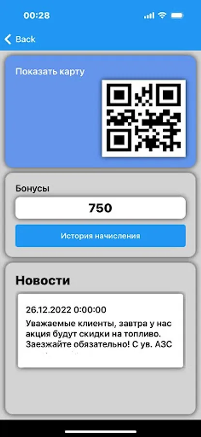 An application for viewing by customers of the Zodchy gas station the accumulated bonuses and the filling log for any date. Also, the application has a built-in qar code for fuel delivery.