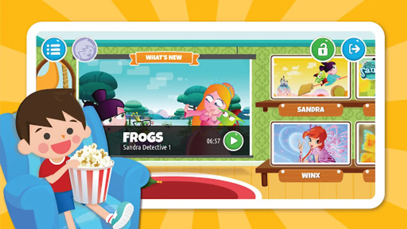 In the TV room, you can browse more than 200 videos organized by characters. New episodes and new popular TV shows are added every month.