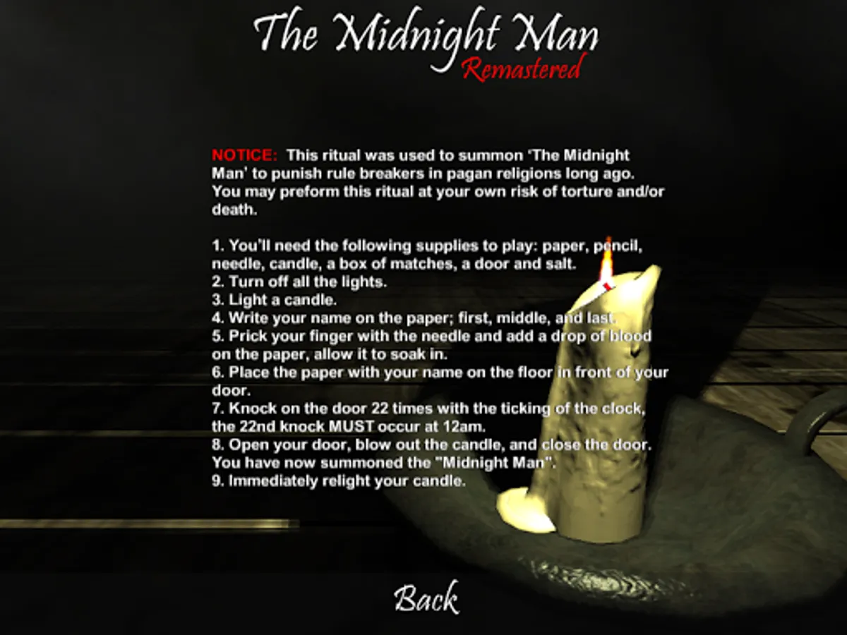 This game is based on a real ritual used to summon ‘The Midnight Man’ to punish rule breakers in pagan religions long ago. Your goal is to avoid the midnight man at all costs until 3:33AM. You may move through the house to avoid him. If he is near; your candle will go out. You will have ten seconds to relight your candle, If not; it’s game over. You cannot re-light your candle if you are near the midnight man.