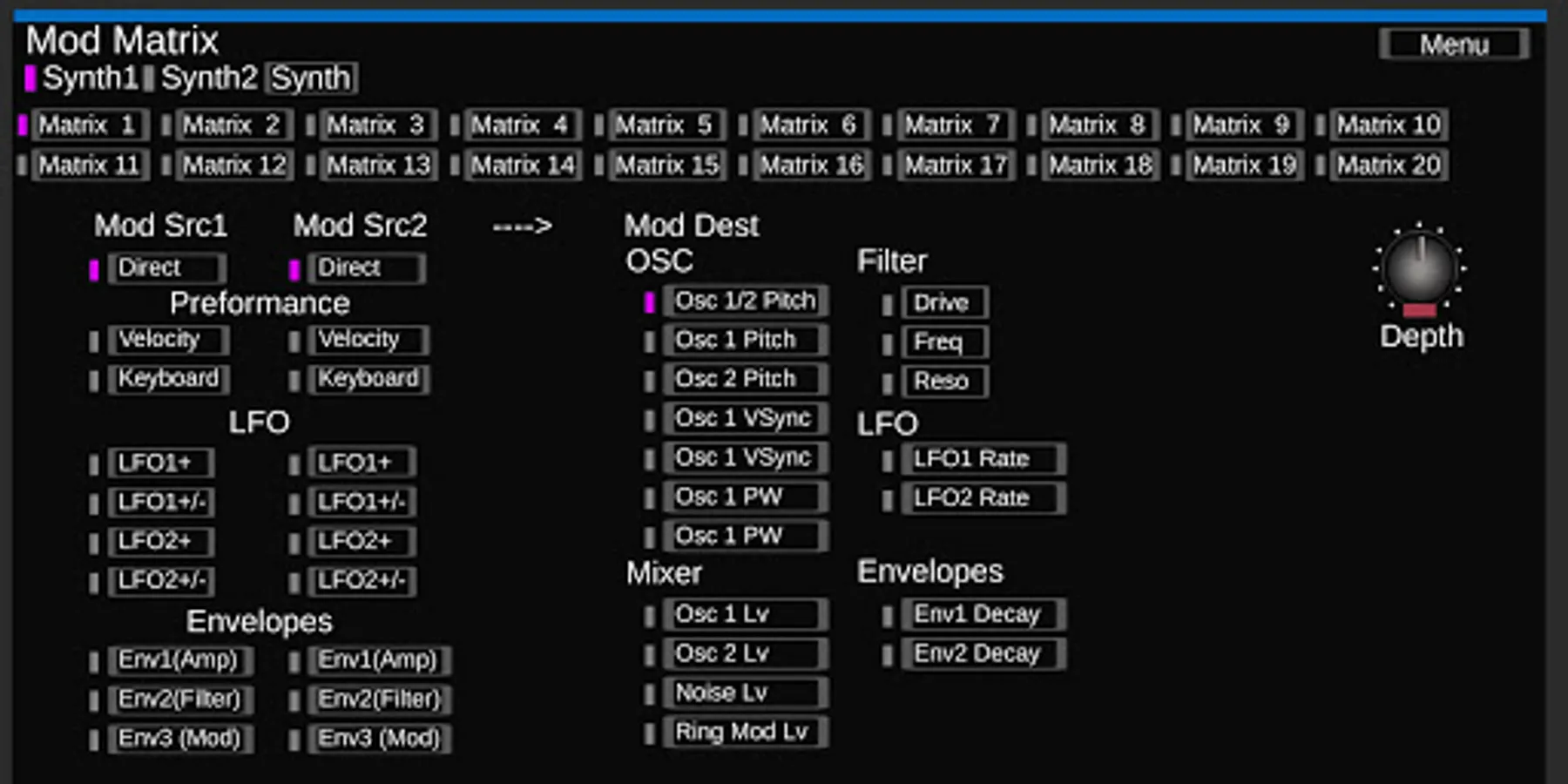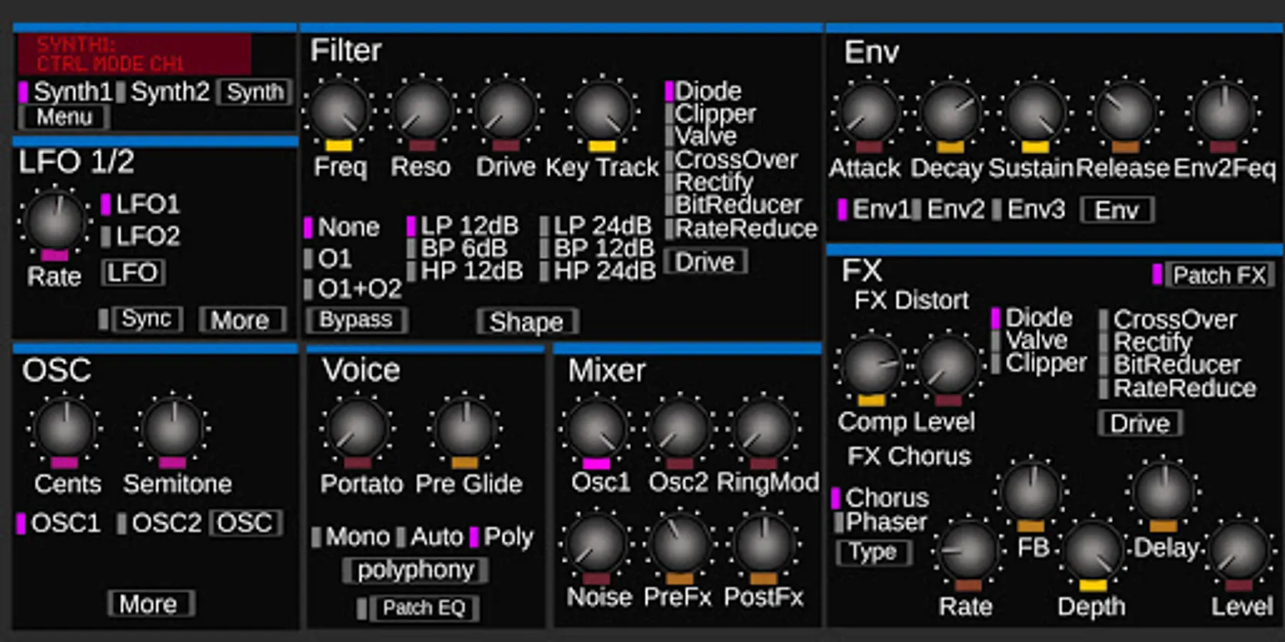 LFO,OSC, OSC Mixer, Filter, Envelope.