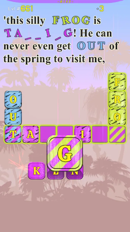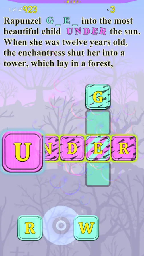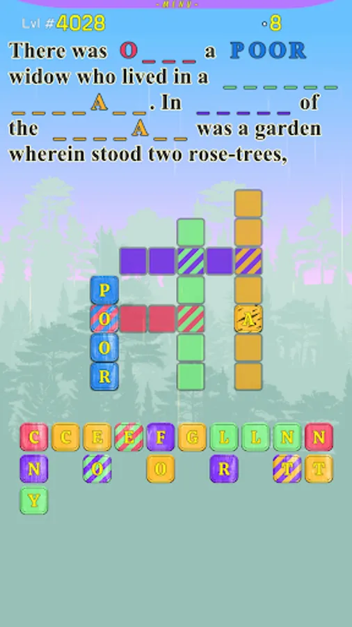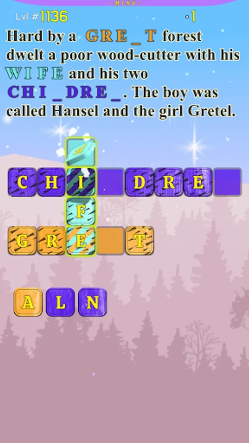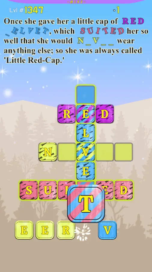 At each level, you will be presented with a section from the story, with a few missing words, that you can fill out by solving the Crossword puzzle below the text. Each letter you fill will appear in the text itself. We made the game very easy to control, it requires just a single touch on each letter below the crossword. All the words are colored in unique colors, letters outside the crossword are colored too, the player needs to fill the letters into words by touching them in the correct order in the words. Each letter that the player touches will jump right into the first available place in a word with the same color. If the letter is in the wrong place, it will be marked with a yellow dot that will blink. The player can easily correct the placement of a letter in the wrong place, by touching it, it will jump outside, and then the player should touch the right letter belonging to the next free place in the words. The letters that belong to two words are marked with diagonal lines, with colors from both words. When a user touches such a letter, it jumps right into its correct place.