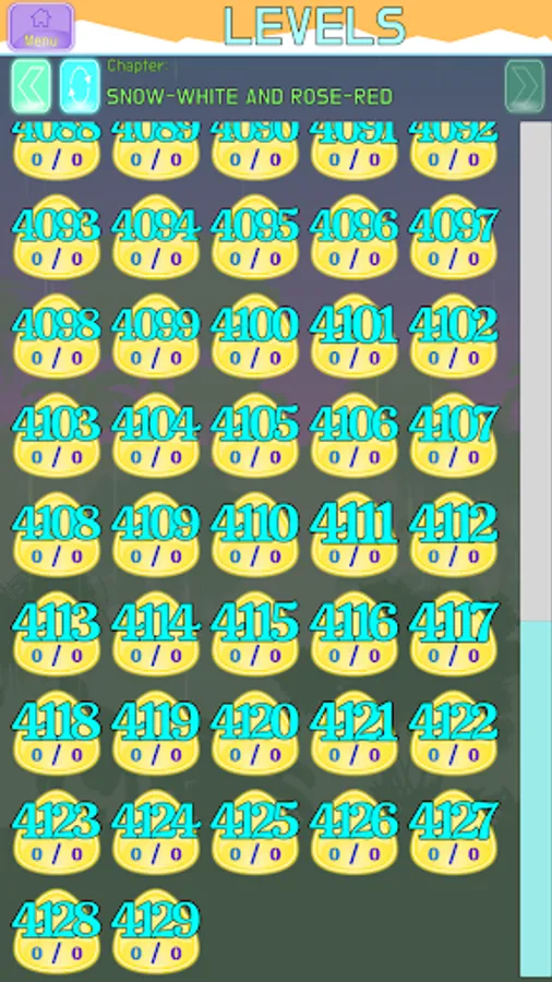 The story is split into levels, with 4129 levels in total. The game always remembers the last level that the player played, so the player can always continue by pressing on a "Play" button on the main screen. The player can jump to other sections by selecting the number of the level in the "Levels" screen. To refresh the memory, the player can jump back with "Back", in the top part of the game screen, or jump to the next level with the "Next" button.
