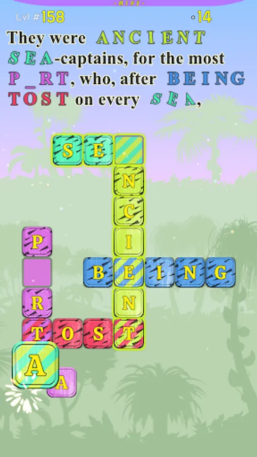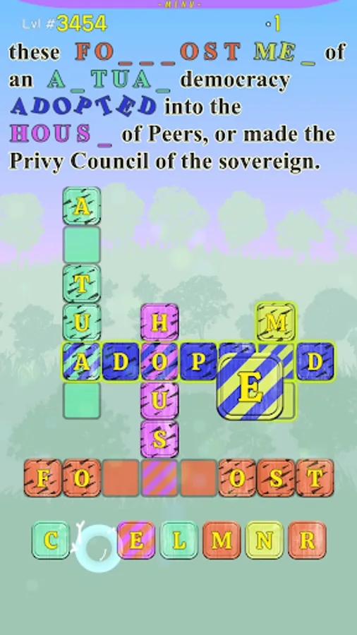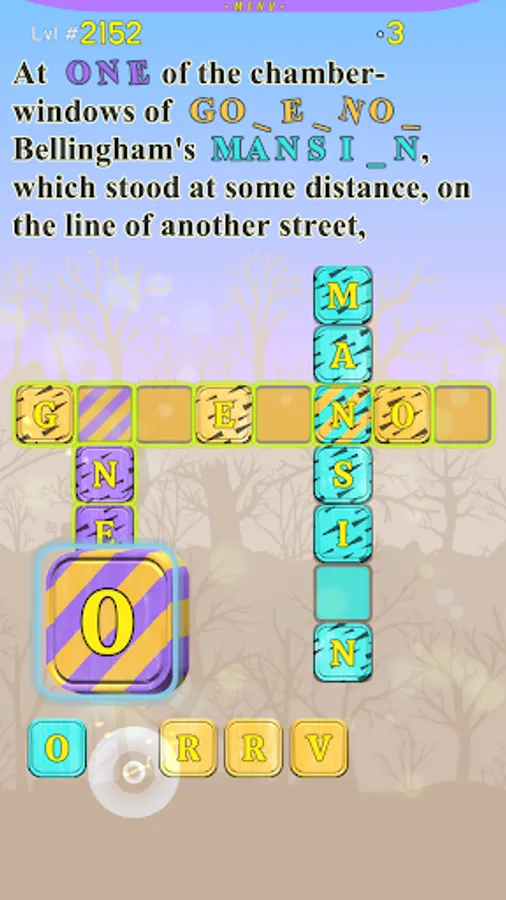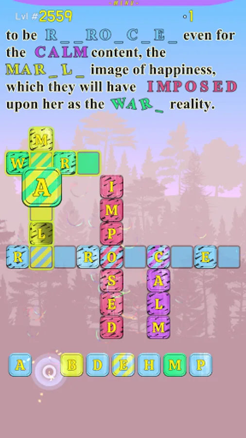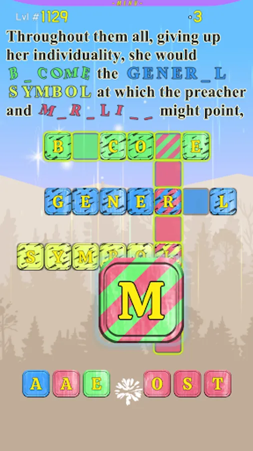 At each level, you will be presented with a section from the story, with a few missing words, that you can fill out by solving the Crossword puzzle below the text. Each letter you fill will appear inside the text itself. We made the game very easy to control, it requires just a single touch on each letter below the crossword. All the words are colored in unique colors. Letters outside the crossword are colored too, the player needs to fill the letters into words by touching them in the correct order in the words. Each letter that the player touches will jump right into the first available place in a word with the same color. If the letter is in the wrong place, it will be marked with a yellow dot that will blink. The player can easily correct the placement of a letter in the wrong place, by touching it, it will jump outside, and then the player should touch the right letter belonging to the next free place in the words. The letters that belong to two words are marked with diagonal lines, with colors from both words. When a user touches such a letter, it jumps right into its correct place.