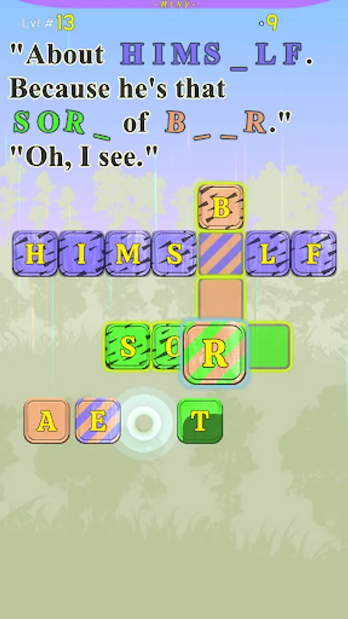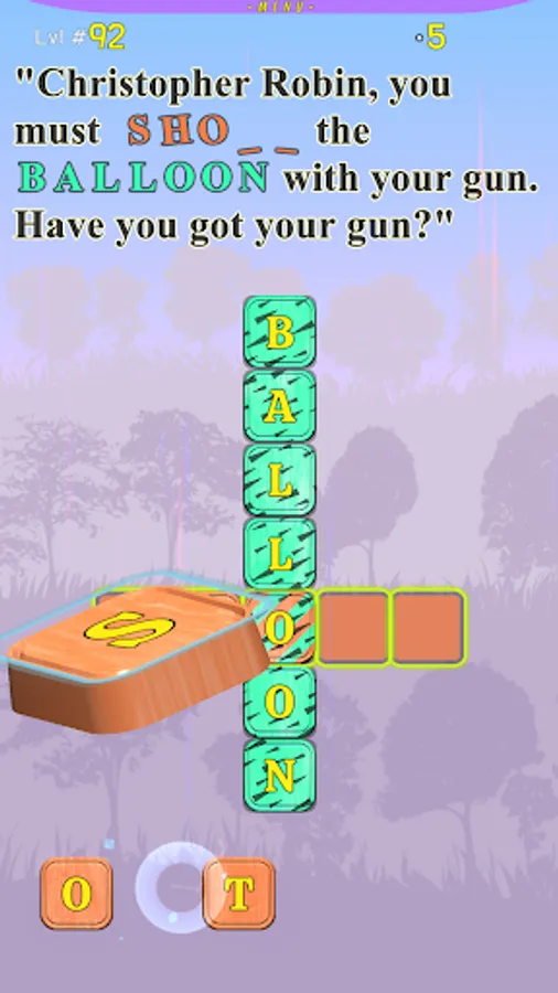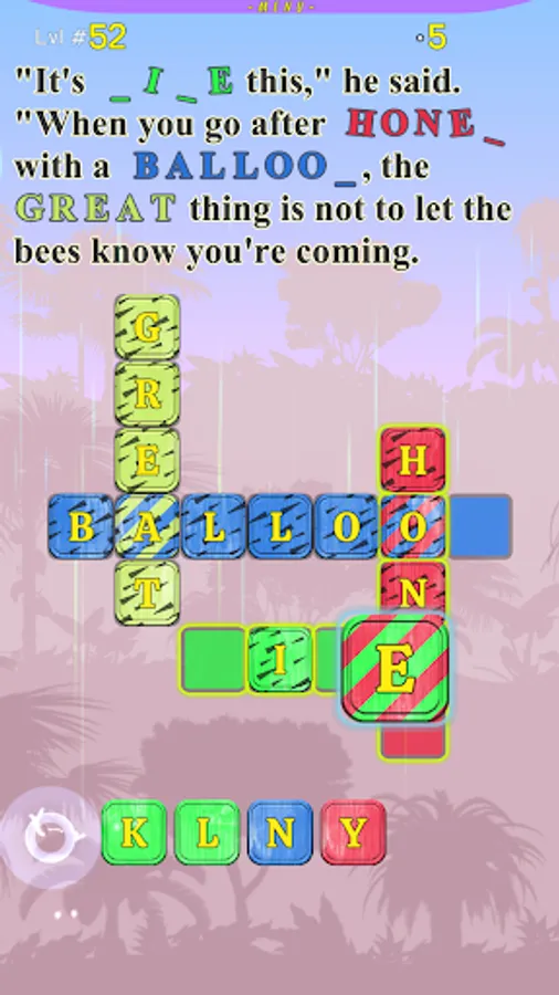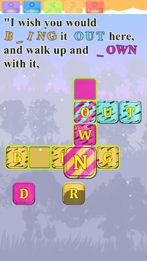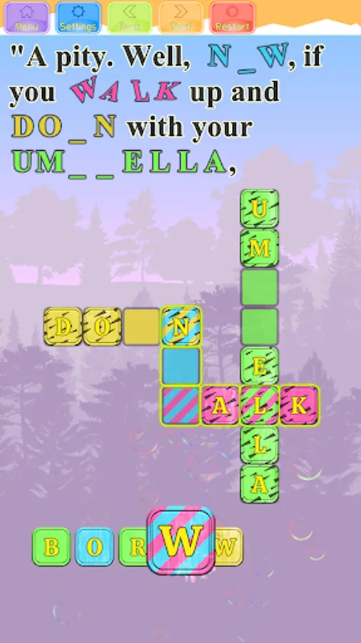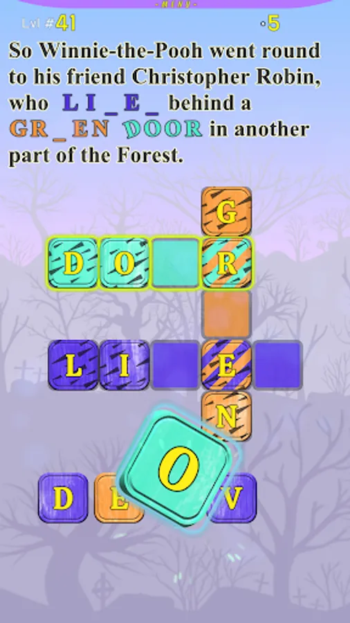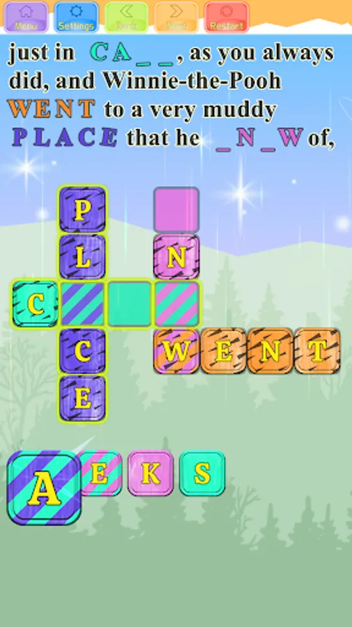 At each level, you will be presented with a section from the story, with a few missing words, that you can fill out by solving the Crossword puzzle below the text. Each letter you fill will appear inside the text itself. We made the game very easy to control, it requires just a single touch on each letter below the crossword. All the words are colored in unique colors. Letters outside the crossword are colored too, the player needs to fill the letters into words by touching them in the correct order in the words. Each letter that the player touches will jump right into the first available place in a word with the same color. If the letter is in the wrong place, it will be marked with a yellow dot that will blink. The player can easily correct the placement of a letter in the wrong place, by touching it, it will jump outside, and then the player should touch the right letter belonging to the next free place in the words. The letters that belong to two words are marked with diagonal lines, with colors from both words. When a user touches such a letter, it jumps right into its correct place.