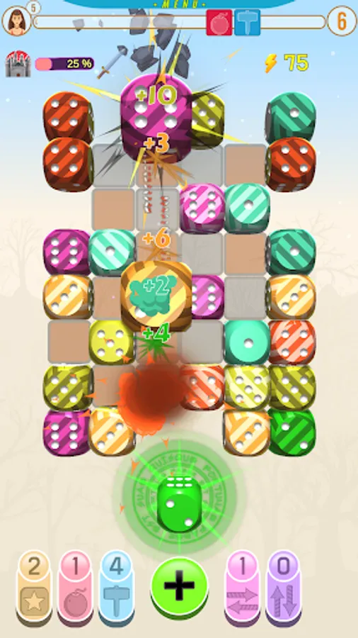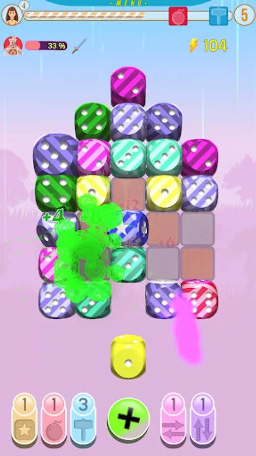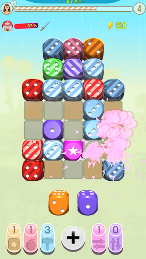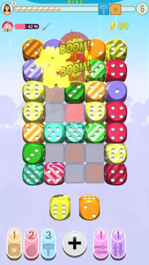 When in trouble player can use a booster: 1. Mighty Hammer - strike and destroy any dice with direct lightning. 2. Bomb - clear 3x3 area. 3. Add a Star that we can move inside the board. 4. Rockets attack - clear line or column from all dices. At the start, the player receives an initial amount of boosters, and players wins additional boosters by playing more and leveling up, by merging m more dice. The player can choose their avatar and nickname by clicking on the avatar icon.