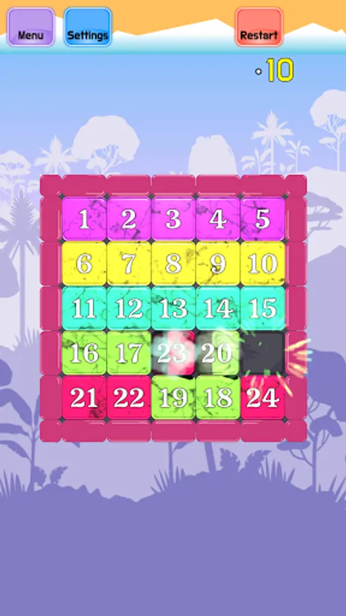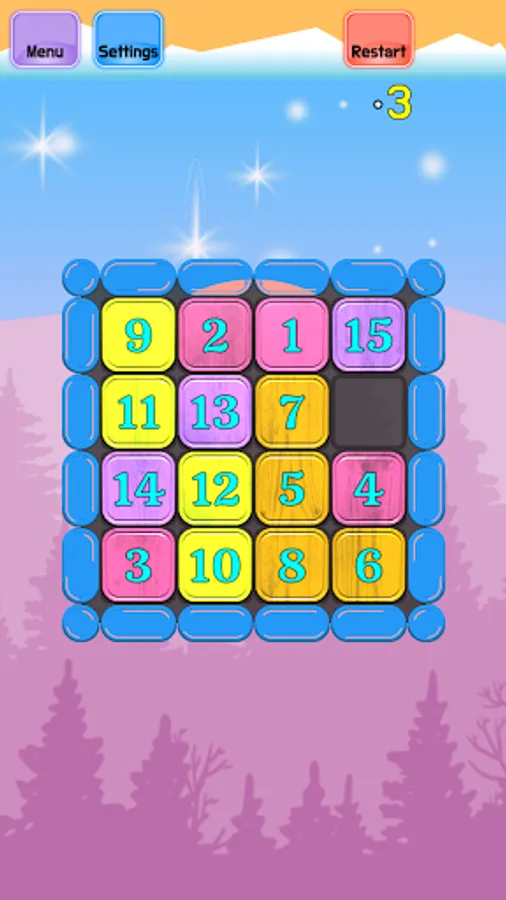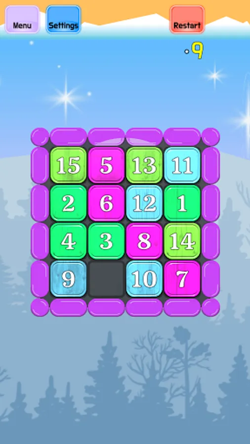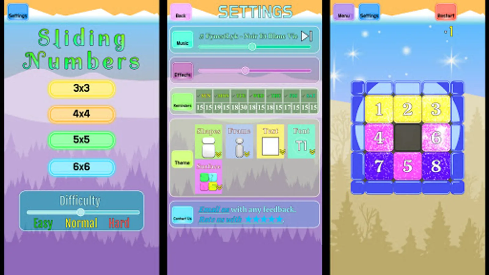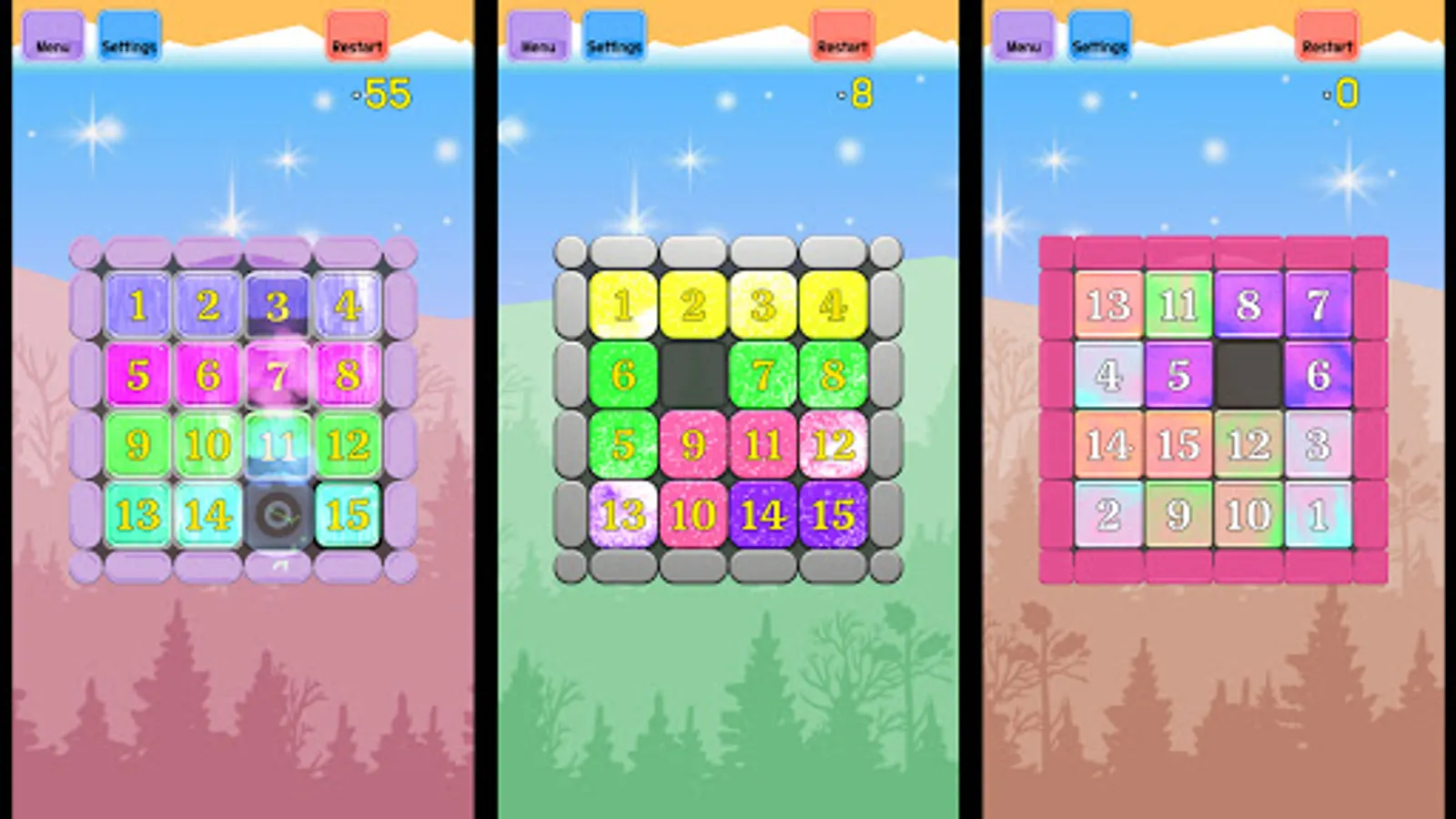The player can move multiple tiles at once by touching tiles on the same column or row with the empty space. There are five dynamic backgrounds to enhance the visual appeal of the game and convey a relaxing feeling to the player, with natural landscapes.