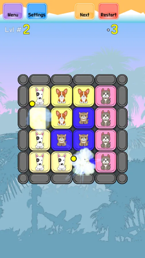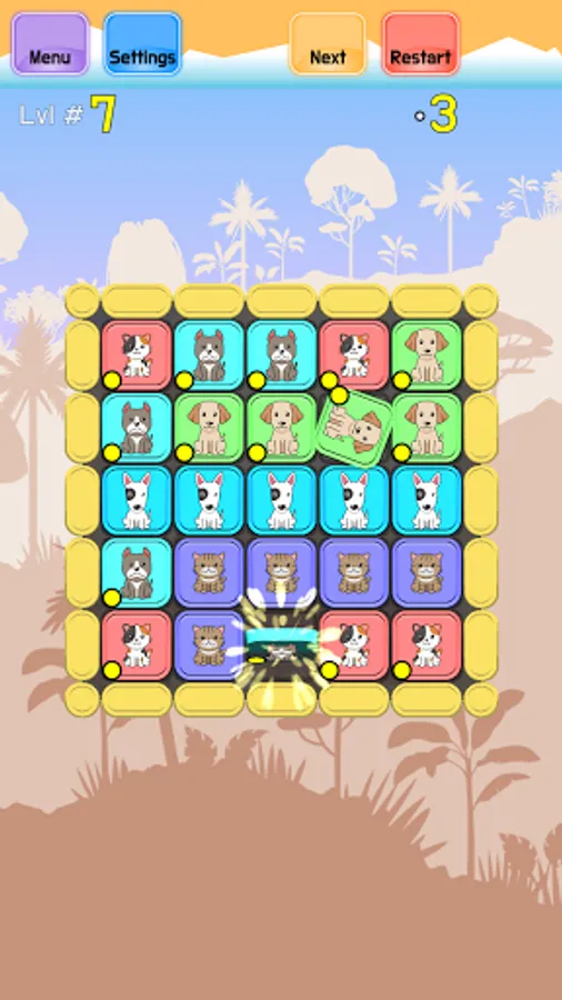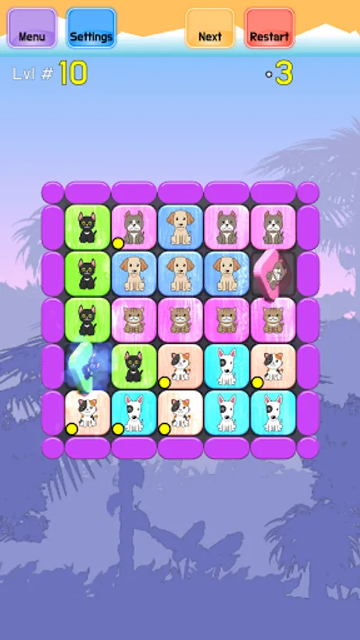 The goal of the game is to arrange the board so all images from the same type are arranged in a Match 3 style in lines or columns of size 3 or more, and there are no images that are left without matching 3+ groups. The player can swap any two tiles by touching them one after another, the first one will be clearly shown as selected. With every swap, the game colors all the tiles with white and black frames, to allow the user to see which tiles are properly matched in 3+ groups, and which still need to be arranged. Tiles with a white frame are properly grouped, and tiles with a black frame still need to be placed in 3+ lines or columns of the same type. When all tiles are properly placed with their kind, the puzzle is solved.