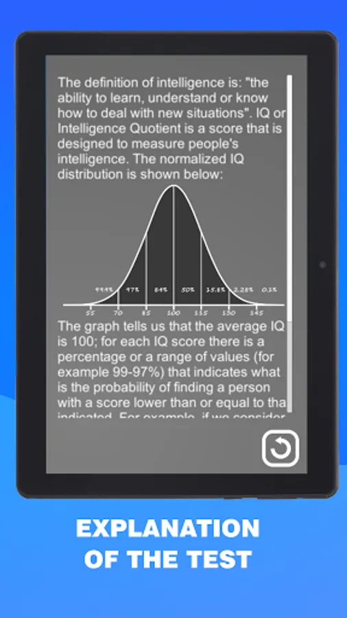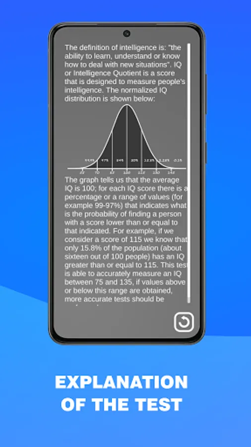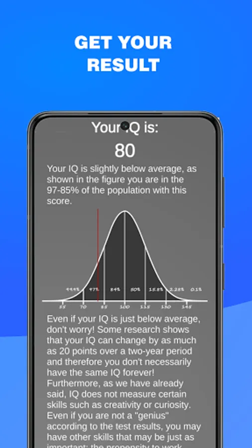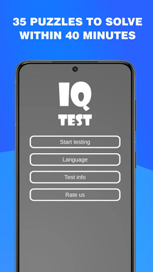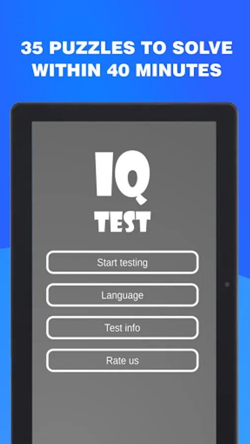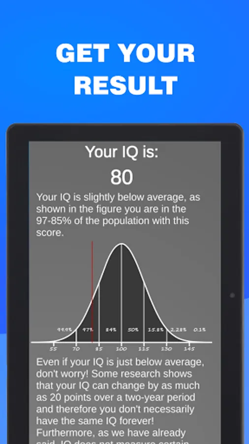 Have you ever wondered how smart you are? Now you can find out! With this app you will be able to find out your intelligence (IQ). The application is completely free to use, it's been developed upon the most common intelligence tests (IQ Test) such as Raven matrix, Mensa Test, Wechsler Adult Intelligence Scale, IQ Eysenck etc. This intelligence test (IQ Test) is capable of measuring IQ in the range of 75-135. The test lasts around 20 to 40 minutes, in this time you will be asked 35 brain teaser which will get gradually harder, at the end of the time, or when you'll answer all the brain teaser your IQ score will be shown to you along with a small description of how to read the result. The test measures only a subset of intellectual abilities. So, valid conclusions can not be drawn about the overall intelligence of the person, the results are approximative. The test will give different results based on the age of the user. Why take an IQ test? -The purpose of taking an IQ test is to measure intelligence, to measure one’s reasoning and problem-solving abilities. - Compare your result with friends - Many more great functions for the IQ Test are still planned! So what are you waiting for? Download the application now and find out how smart you are!