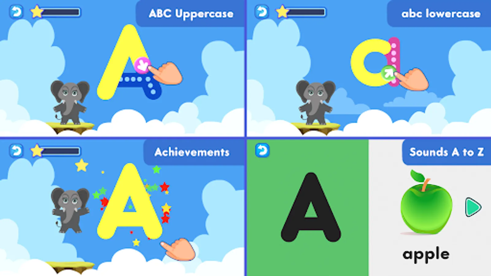 ABC: Learn to trace your ABCs with colorful imagery and sounds. This includes tracing upper case and lowercase letters.