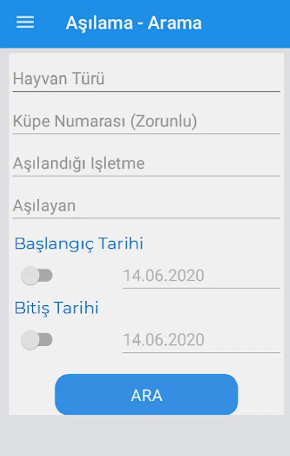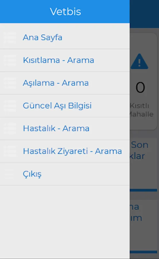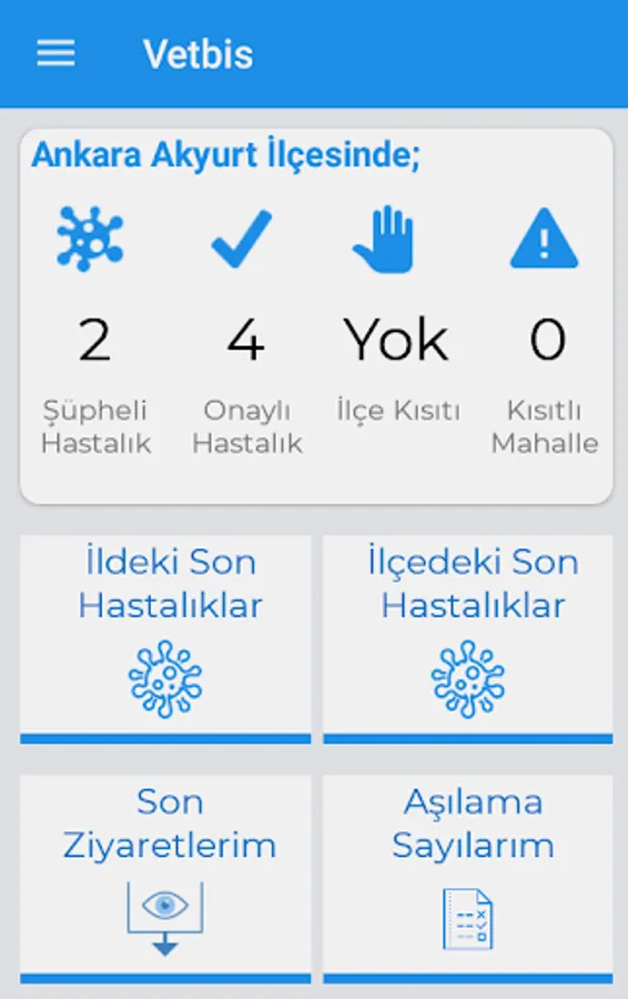 This application, which was prepared for the official veterinarian, veterinary health technician / technician and free veterinarians by the Ministry of Agriculture and Forestry General Directorate of Food and Control, aimed to follow up the infectious and epidemic animal diseases and programmed vaccination studies. At the same time, it is aimed that veterinarians working on the field and veterinary health technicians / technicians will have access to the epidemiological information they need faster. With the application;