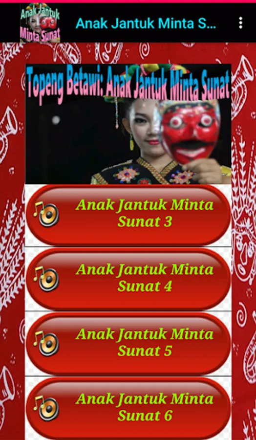 Enjoy the best collection of Betawi masks with the title Anak Jantuk Minta Sunat performed by the Betawi mask group Marga Sari. Enjoy the cuteness of Betawi words from the Betawi Mask Anak Jantuk Minta Circumcision play. Presented in quality offline mp3 audio that can still be listened to even without an internet connection.
