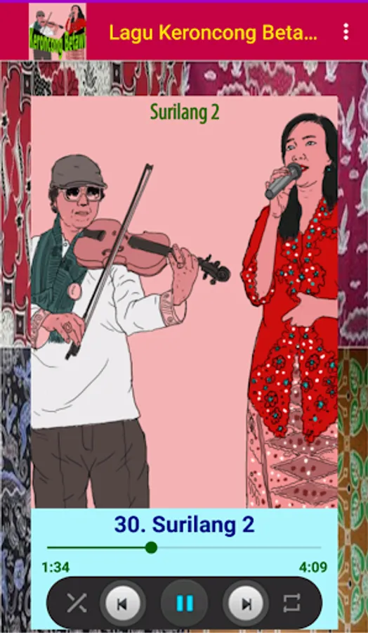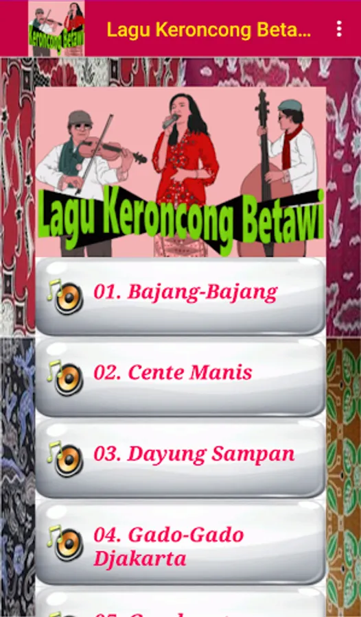 Enjoy the best collection of traditional Betawi Songs in keroncong rhythms performed by famous keroncong orchestra singers. Install and enjoy the best of Betawi Keroncong Songs such as Jali Jali, Keroncong Bandar Jakarta, Keroncong Pasar Gambir, Stambul Jampang, Sunda Kelapa, Surilang, etc. The Betawi Keroncong Song application is perfect for those who are lovers of Betawi culture and keroncong music. All songs can still be enjoyed even without an internet connection. Also can be used as Ringtone, Notification, and Alarm.