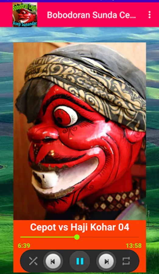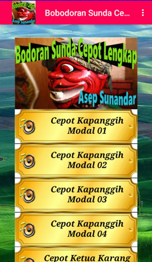 This application contains the best and most complete collection of puppet show bobodoran by puppeteer Ki Asep Sunandar with the main character Kang Cepot such as Cepot Kappleks Modal, Cepot Ngalunjak Ka Semar, Cepot vs Dewala Pikaseurieun, Cepot vs Haji Kohar, etc. Intended for fans of Sundanese funny stories or better known as Bobodoran Sunda. Enjoy Cepot's antics in his interactions with other Tumaritis Village puppet characters such as Semar, Dawala, Ijem, Buta, Kang Ibing, etc. Apart from his antics, this Cepot story also contains many life tips that are taught by the Sundanese culture.