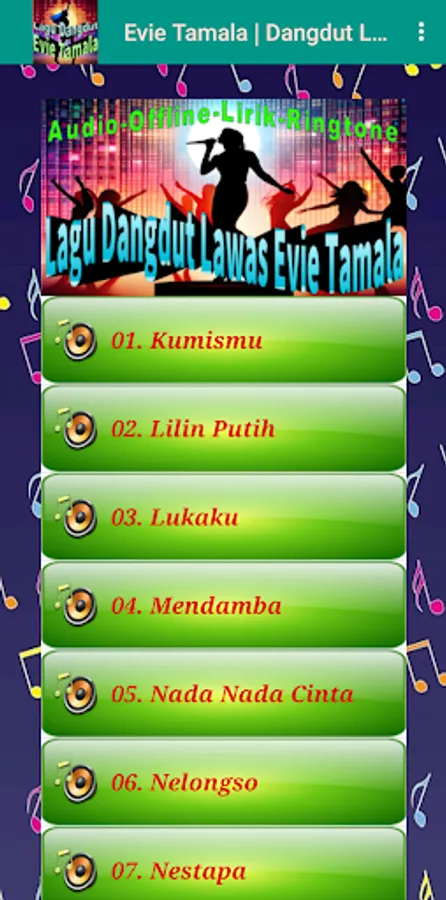 Welcome to the "Evie Tamala Old Dangdut Song" application. Are you a fan of Dangdut music? If so, then this application is a loyal friend to relive the beautiful moments of nostalgia for Dangdut music from the past era.