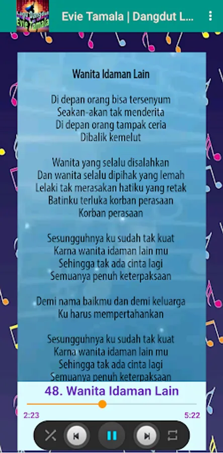 * Song lyrics. All Dangdut songs are equipped with song lyrics making it easier to understand and sing along to each song.