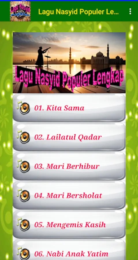 Complete Popular Nasyid Songs is an application that presents a complete collection of popular Nasyid songs. Enjoy Complete Popular Nasyid Songs which contain the most complete collection of Islamic Religious Songs in Nasyid music accompaniment from famous Nasyid groups.