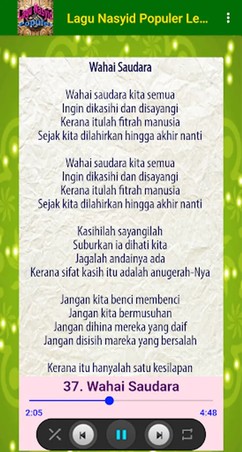 This application is also equipped with song lyrics, so you can follow and sing your favorite songs easily. You don't have to worry about forgetting the lyrics anymore when enjoying your favorite Nasyid songs.