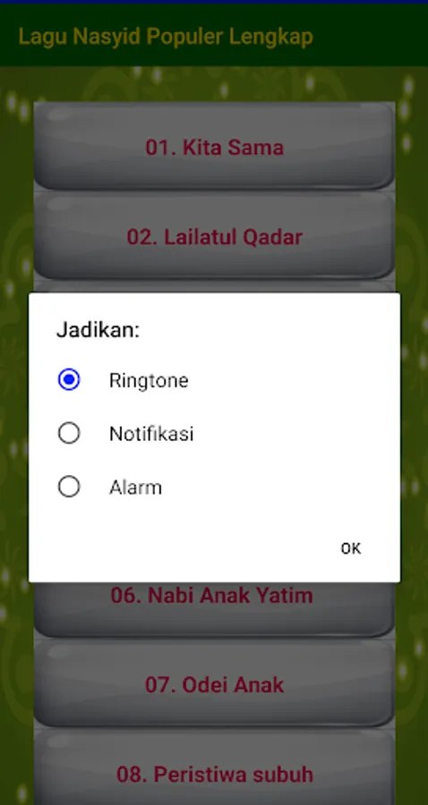 In addition, this application also provides a collection of Nasyid song Ringtones. You can set your favorite song as ringtone on your mobile. With these Nasyid Ringtones, you can personalize your experience with heart touching music.