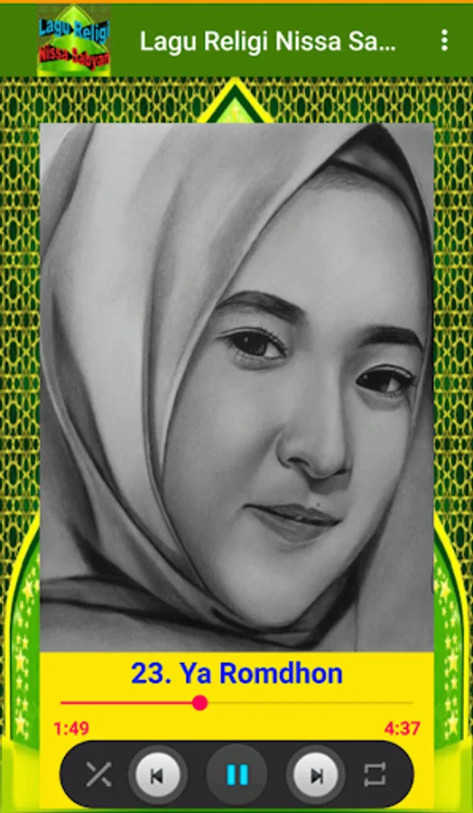 Presented an Islamic application that contains the best collection of Islamic Religious Songs sung by the famous Gambus singer, Nissa Sabyan. Install and enjoy the melodious sound of Nissa Sabyan in bringing the most popular Islamic religious songs such as Allahumma Labbaik, Eid al-Fitr, Ya Asyiqol Musthofa, Ya Romdhon, etc.
