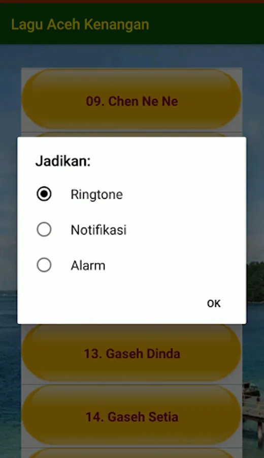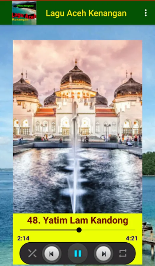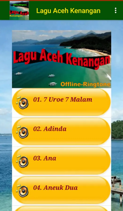 The Aceh Memories song contains the best collection of Acehnese nostalgic songs (such as Purnama Lhok Geulumpang, Loeng Teupu Gata Ureung Kaya, Keupeu Chit Neu Rayu, Bintang Kejora, etc.) sung by famous Acehnese singers. Install and enjoy the melodious voice of the singers performing songs in Acehnese. All songs are presented in a quality offline audio format. Also included is the Ringtone feature.