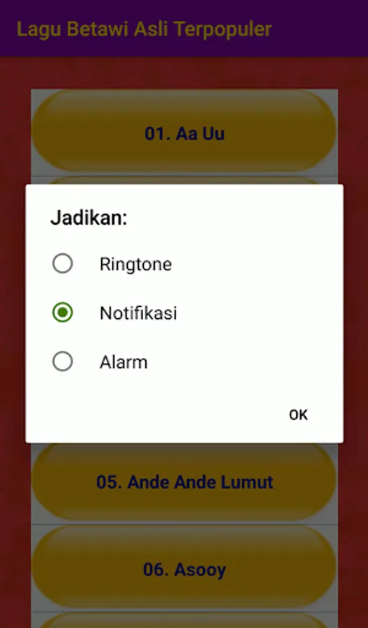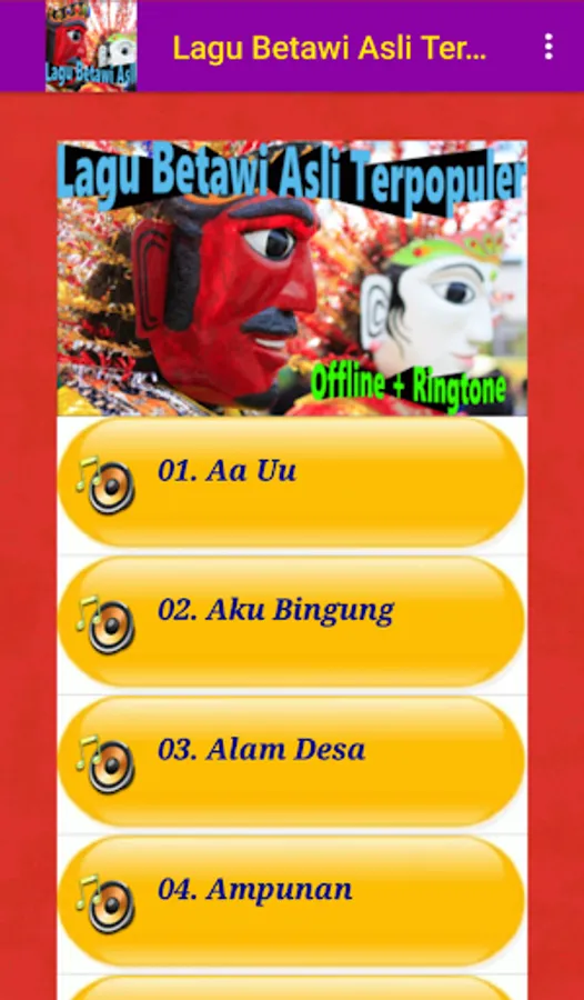Most Popular Original Betawi Songs contains the most complete collection of Betawi songs sung by the great Betawi native artist, Benjamin Sueb (or better known as Benjamin S). Install and enjoy Betawi songs that pamper the ears of Betawi music fans such as Aku Confused, Biang Kerok, Dipatil Ikan Sembilang, Gua Ngga Nerti, etc. Presented in quality offline audio, you can still listen to it even without an internet connection. Equipped with a Ringtone feature so that it can be used as an Alarm, Notification, and Ringtone.