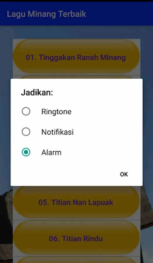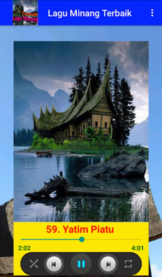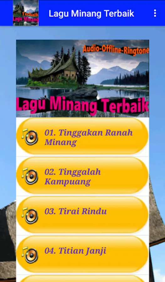Best Minang Songs contains a collection of relatively popular and best Minang songs from famous Minang singers such as Tinggakan Ranah Minang, Tukang Boto, Ubekkan Denai, Usah Baputuih Aso, etc. Install and enjoy the beautiful strains of Minang music that will definitely bring back memories of your hometown in the Padang area. Very appropriate for those who are wandering or living in the Minang realm. All songs can still be heard even without an Internet connection. Each song can be used as a Ringtone, Alarm, or notification on an Android gadget.