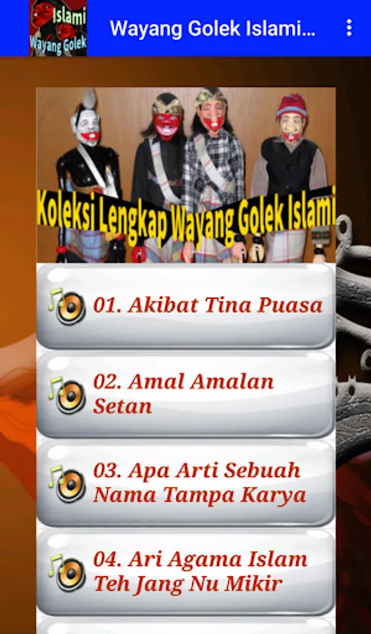 A complete collection of Islamic Wayang Golek applications is presented, which contains a complete collection of Sundanese puppet shows with Islamic teachings such as the Charity of Satan's Practices, Inalillahi Wainalillahi Rojiun's Dalil, Mamah Dedeh's Rival, Semar Ngaguar Elmu Marifat, etc ... This Golek puppet is performed by famous puppeteers from Java West. Install and enjoy Islamic teachings that are easy to digest because they are delivered in a Sundanese wayang golek performance that is full of jokes (bobodoran).