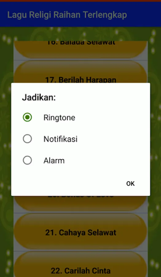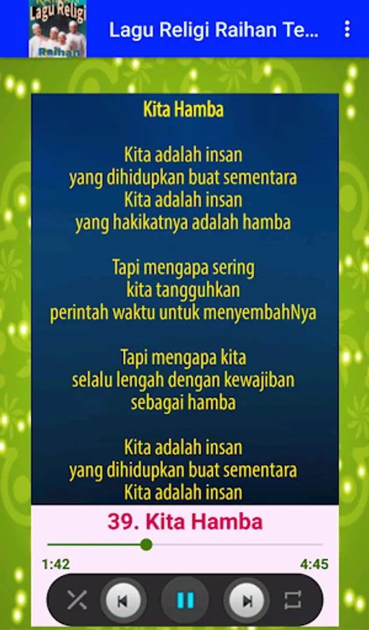Once again, one of the best Islamic applications for Android gadgets is presented. The Complete Religious Songs of Raihan are presented which contain the most complete collection of Islamic Religious Songs from the famous Nasyid group, Raihan. Install and enjoy the beautiful compositions of Raihan's best songs, such as Anak Permata, Give Hope, True Love, Recitation Prayer, Sincerity, etc.