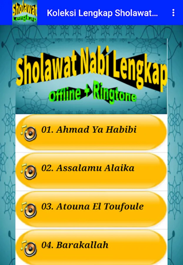 An Islamic application is presented which contains the best and most complete collection of the Prophet's Prayers sung by the famous Gambus singer. Install and enjoy the melodious voices of the singers in bringing the best Prophet's Prayers such as Hasbi Rabbi Jallallah, Mauju Qolbi, Rohman Ya Rohman, Ya Habibal Qolbi, Ya Nabi Salam Alaika, etc.