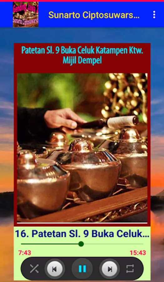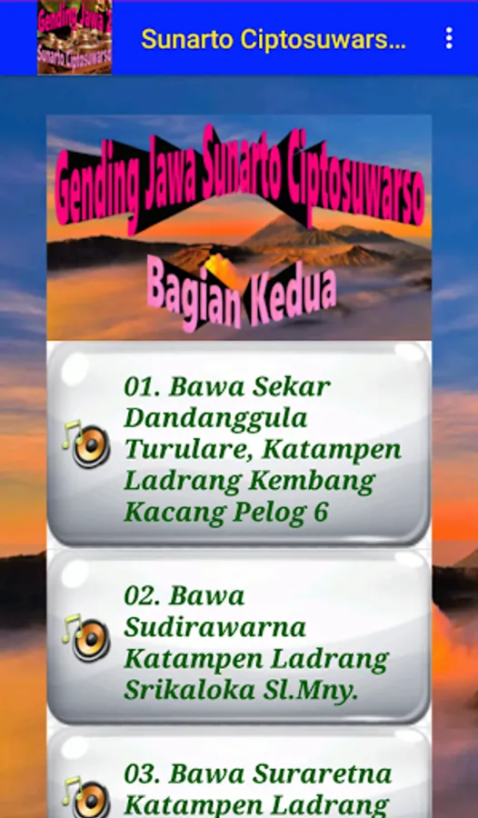 The second part of the Sunarto Ciptosuwarso Javanese Gending Song application is presented which contains the best works of the legendary Javanese culturalist, Ki Sunarto Ciptosuwarso. Enjoy the beauty of the Javanese Gending music chorus with the melodious voice of Sinden-Sinden exposed to the land of Jawi. Enjoy the best Javanese Gending from Ki Sunarto Ciptosuwarso such as Ketawang Kinanthi Pawukir Sl. Mnyr., Ladrang Bribil-Gunjuk Slendro 9, Ladrang Kagok Madura Sl. 9, Ldr. Gleyong Pl. 6, etc. Of course this application is very suitable for use by fans of Javanese culture, especially the art of music.