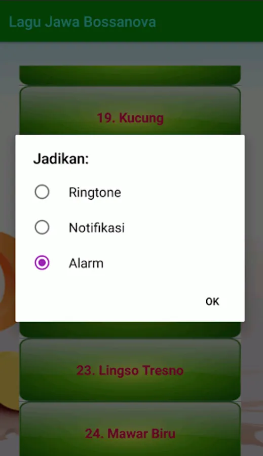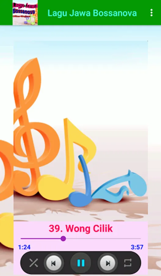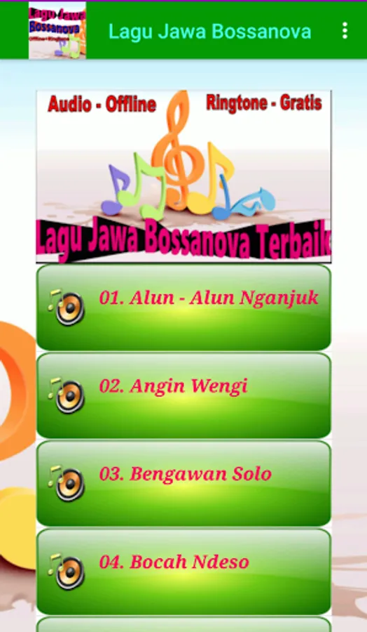The Javanese song Bossanova contains the best collections of Javanese songs in Bossa Nova jazz rhythms such as Alun - Alun Nganjuk, Ilat Tanpo Balung, Layang Kangen, Nandang Bronto, etc. Install and enjoy the beautiful blend of Javanese songs with Bossanova music. All songs can still be enjoyed even if not connected to the Internet. Every bossanova song can be used as Ringtone, Alarm, and Notification.