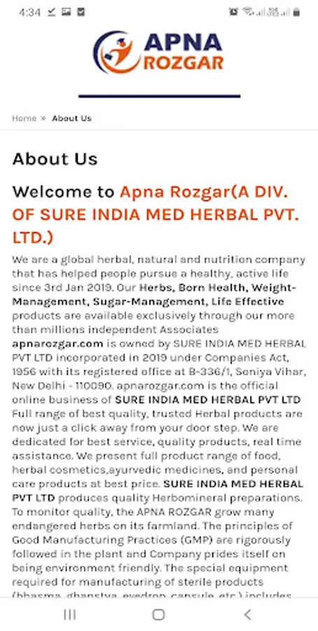 We are a global herbal, natural and nutrition company that has helped people pursue a healthy, active life since 3rd Jan 2019. Our Herbs, Born Health, Weight-Management, Sugar-Management, Life Effective products are available exclusively through our more than millions independent Associates apnarozgar.com is owned by SURE INDIA MED HERBAL PVT LTD incorporated in 2019 under Companies Act, 1956 with its registered office at B-336/1, Soniya Vihar, New Delhi - 110090. apnarozgar.com is the official online business of SURE INDIA MED HERBAL PVT LTD Full range of best quality, trusted Herbal products are now just a click away from your door step. We are dedicated for best service, quality products, real time assistance. We present full product range of food, herbal cosmetics,ayurvedic medicines, and personal care products at best price. SURE INDIA MED HERBAL PVT LTD produces quality Herbomineral preparations. To monitor quality, the APNA ROZGAR grow many endangered herbs on its farmland. The principles of Good Manufacturing Practices (GMP) are rigorously followed in the plant and Company prides itself on being environment friendly. The special equipment required for manufacturing of sterile products (bhasma, ghanstva, eyedrop, capsule, etc.) includes component washing machines, steam sterilizers, membrane filter machines, manufacturing vessels, blenders, liquid filling machines, powder filling machines, sealing and labelling machines, vacuum testing chambers, inspection machines, lyophilisers, pressure vessels, etc. are provided depending on the type and volume of activity. We are a global herbal, natural and nutrition company that has helped people pursue a healthy, active life. We have available exclusively through our independent Associates.