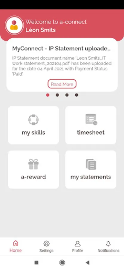 Long description: Use the a-connect app to get mobile access to your time sheet, view your latest statements, review and update your profile and experience, see and use your a-coins, get notifications from the myconnect portal directly on your mobile phone and more to come.