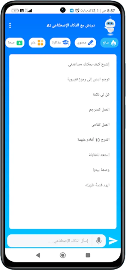 Chat with artificial intelligence AI, ask an intelligent robot AI, is a kind of language model. AI Chatbot is powered by API ChatGPT, Arabic GPT.