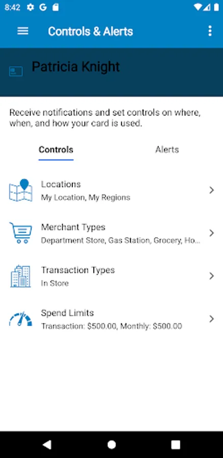 The My location control can restrict transactions to merchants located within a certain range of your locations using your phone’s GPS, transactions requested outside the specific range can be declined. The My Region control uses city, state country or zip code on an expandable interactive map, transactions requested by the merchants outside of a specific region can be declined.
