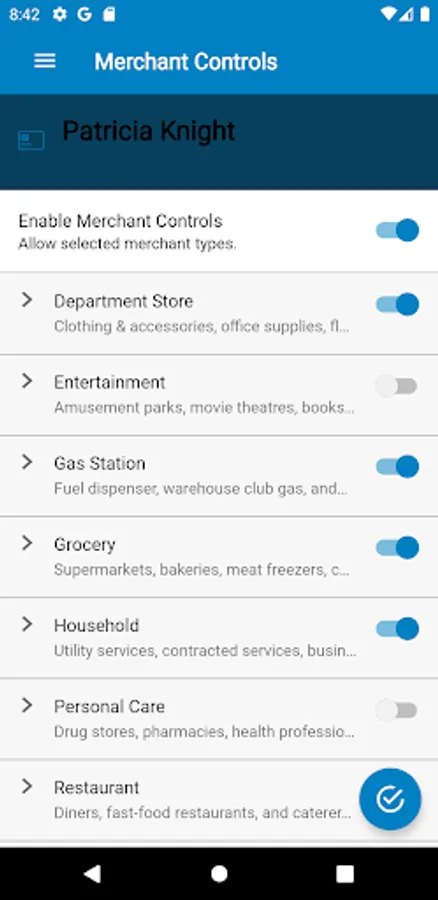 Spending limits can be established to allow transactions up to a certain dollar value and decline transactions when amounts exceed your defined thresholds. Transaction can be monitored and managed for specific merchant categories such as gas stations, department stores, restaurants, entertainment, travel and groceries. And you transaction can also be monitored for specific transaction types in store purchases, e-commerce transactions, mail/phone orders and ATM transactions.